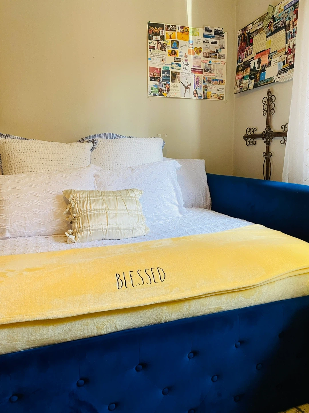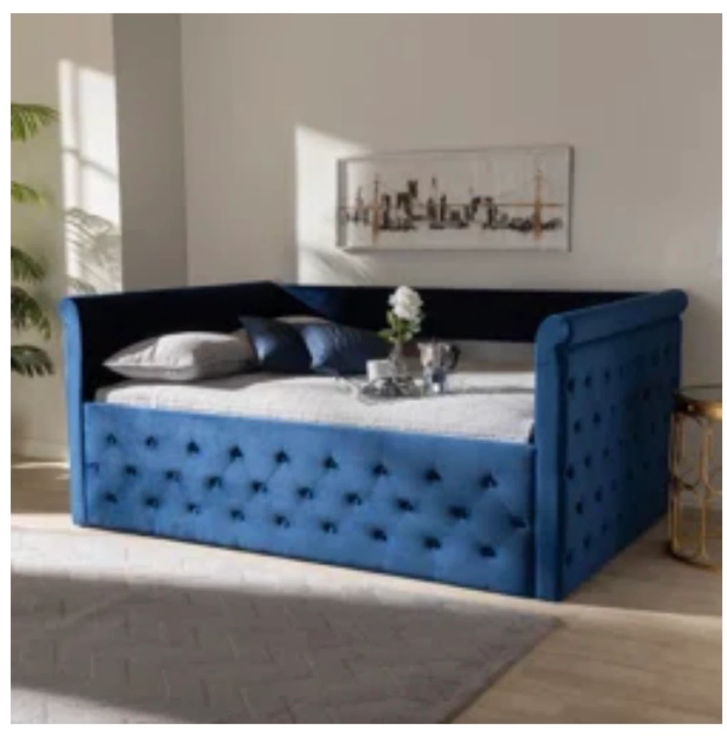 This modern, deep-blue velvet daybed's engineered wood frame is foam padded and upholstered in lush velvet fabric. This collection features scrolled arms with a button-tufting design on each side panel, as well as the front panel of the bed. The daybed exudes a luxe, high-end look while providing you with a place to rest and relax in your bedroom or guest room. The deep blue hue looks luxurious and modern.