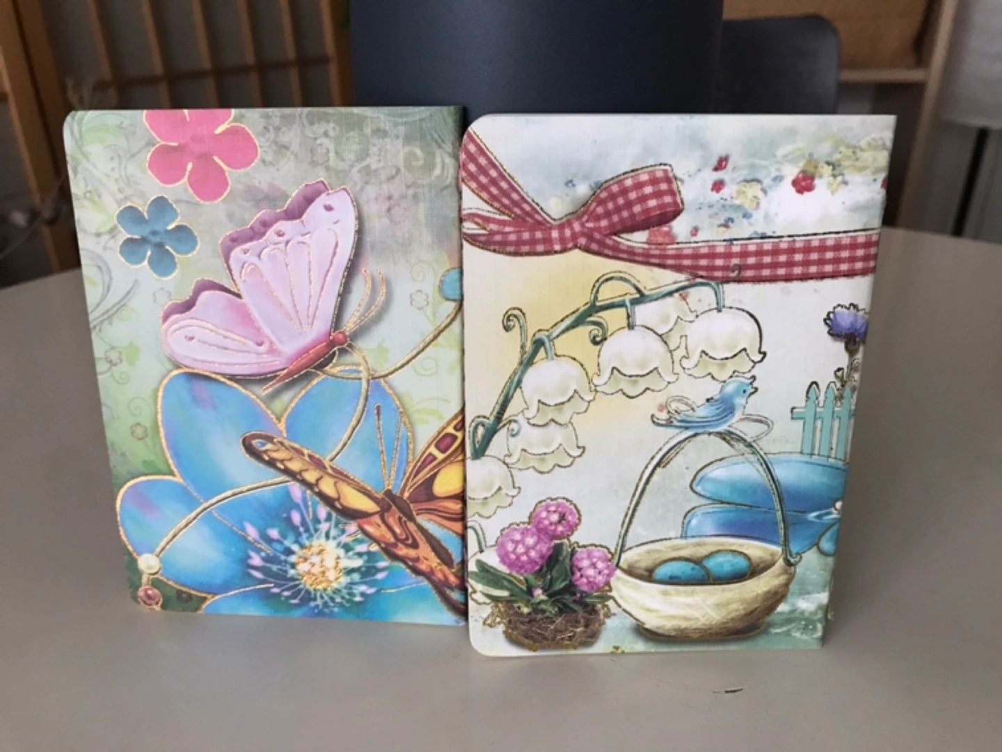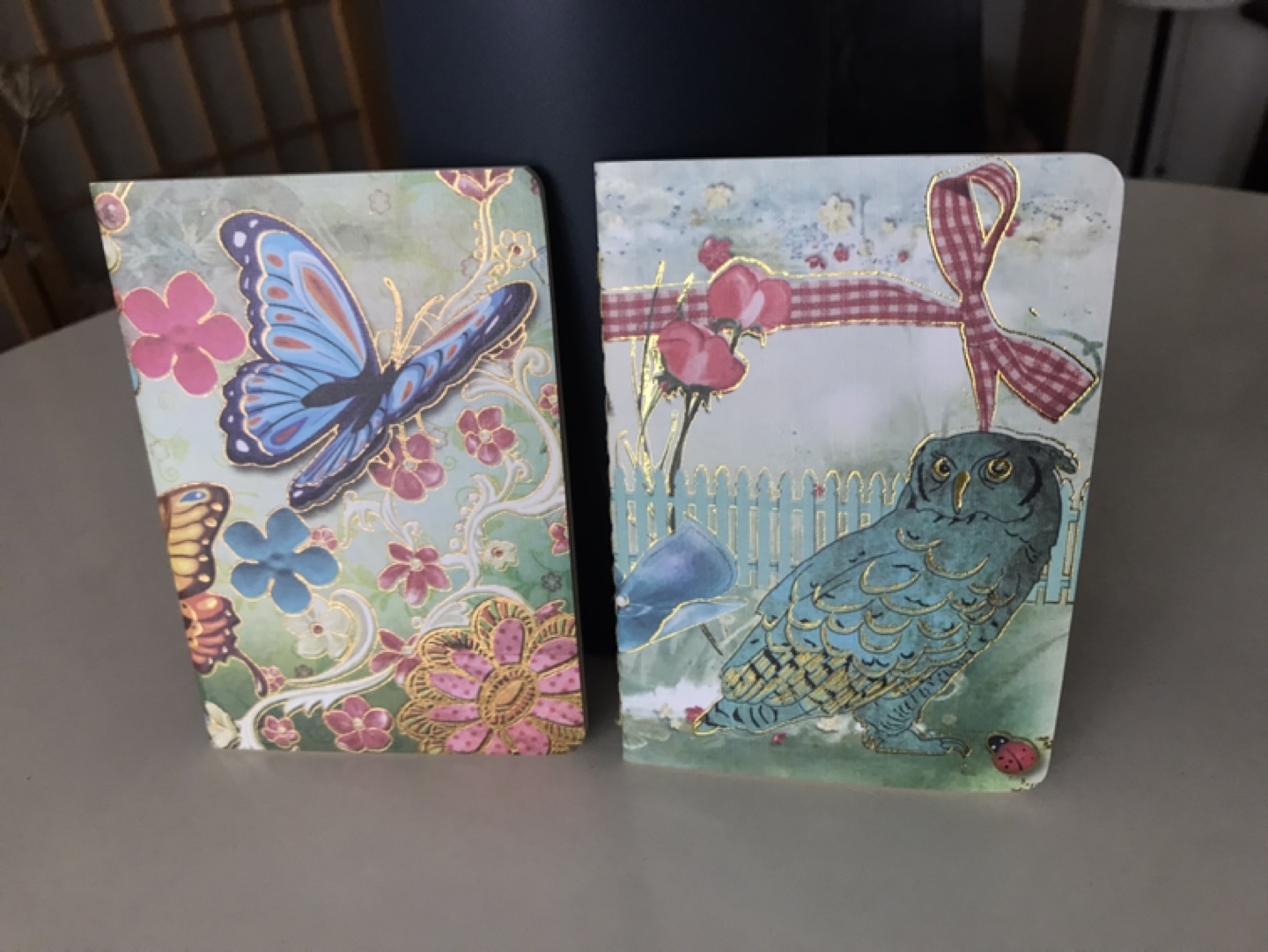 A pair of lined notebooks/journals. Lined on one side of page, blank on the other side (for drawings, doodles, sketches…)