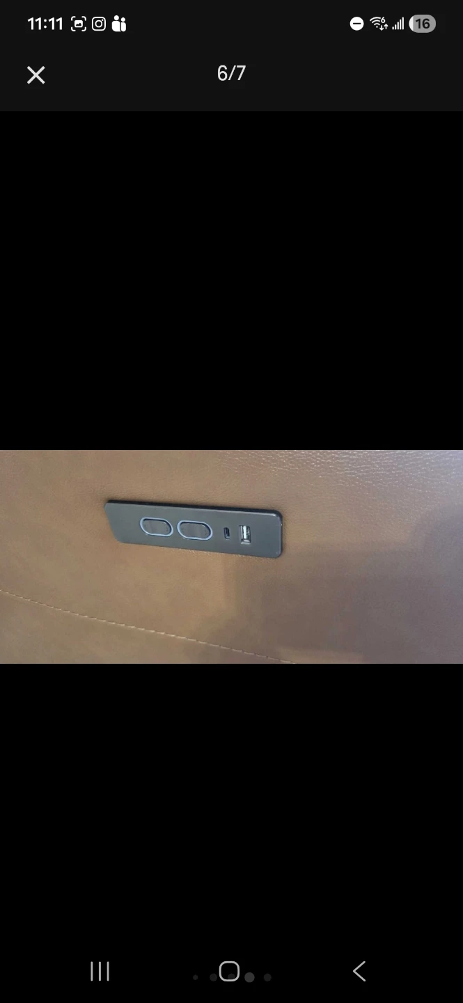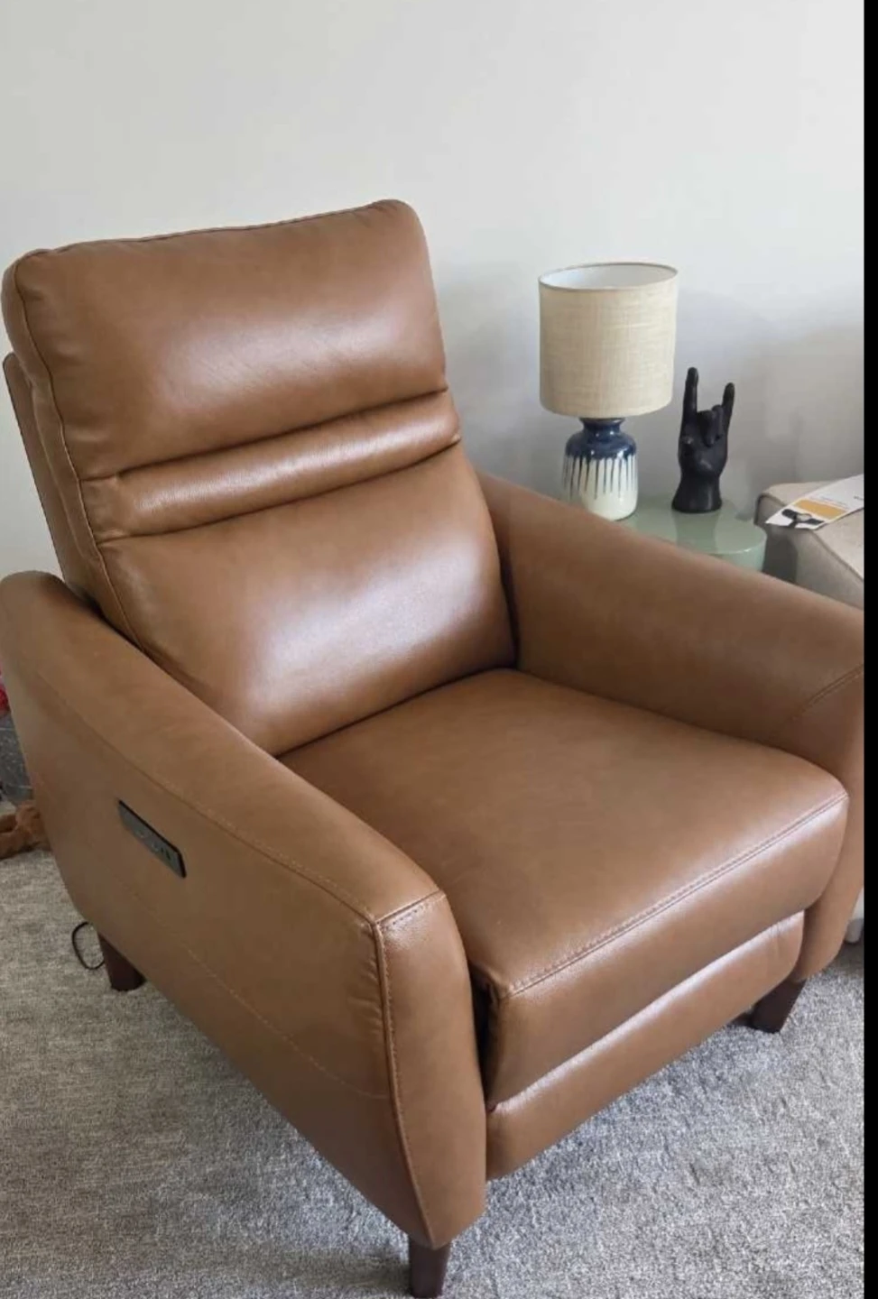 Full leather recliner chair! It features a built-in control panel with USB charging ports on the side. Perfect for relaxing after a long day.