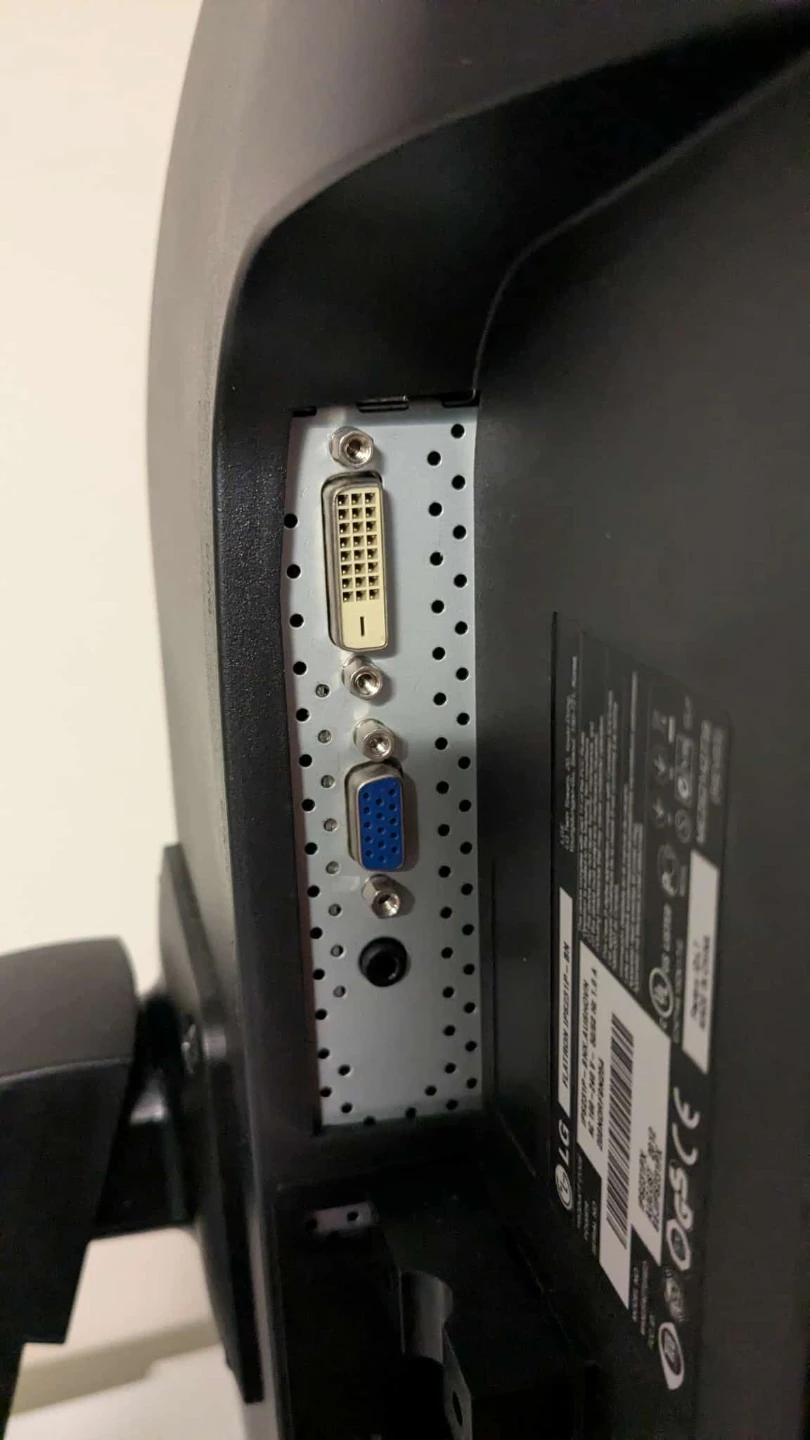 It has some wear and tear on the frame, as shown in the photos. It includes DVI and VGA ports.