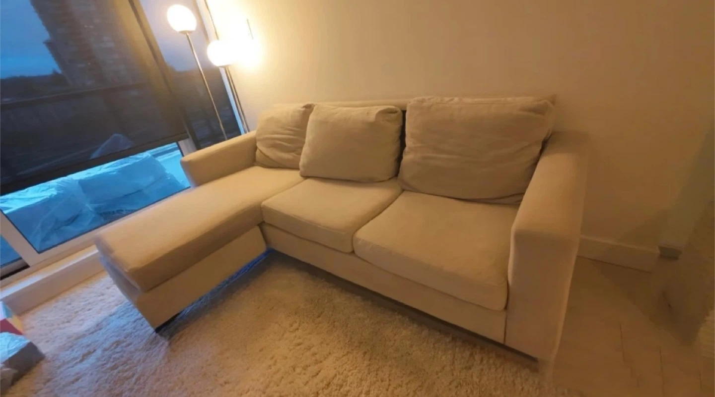 Selling a comfy beige sectional sofa! It features a chaise lounge, perfect for relaxing. The couch is in good condition and would be a great addition to any living room