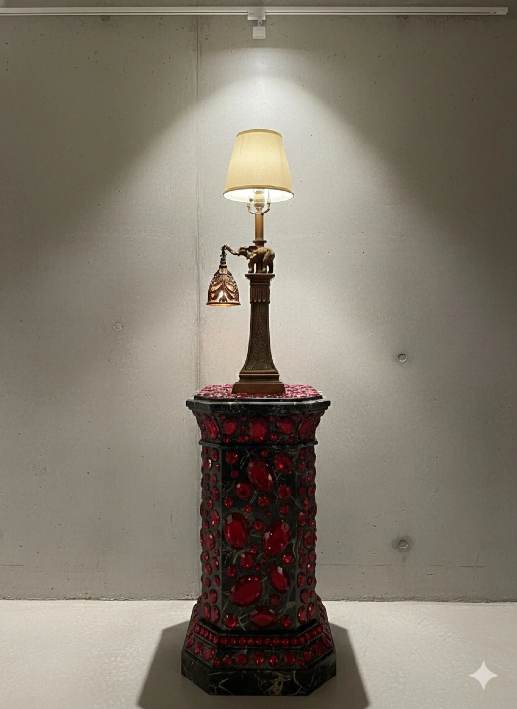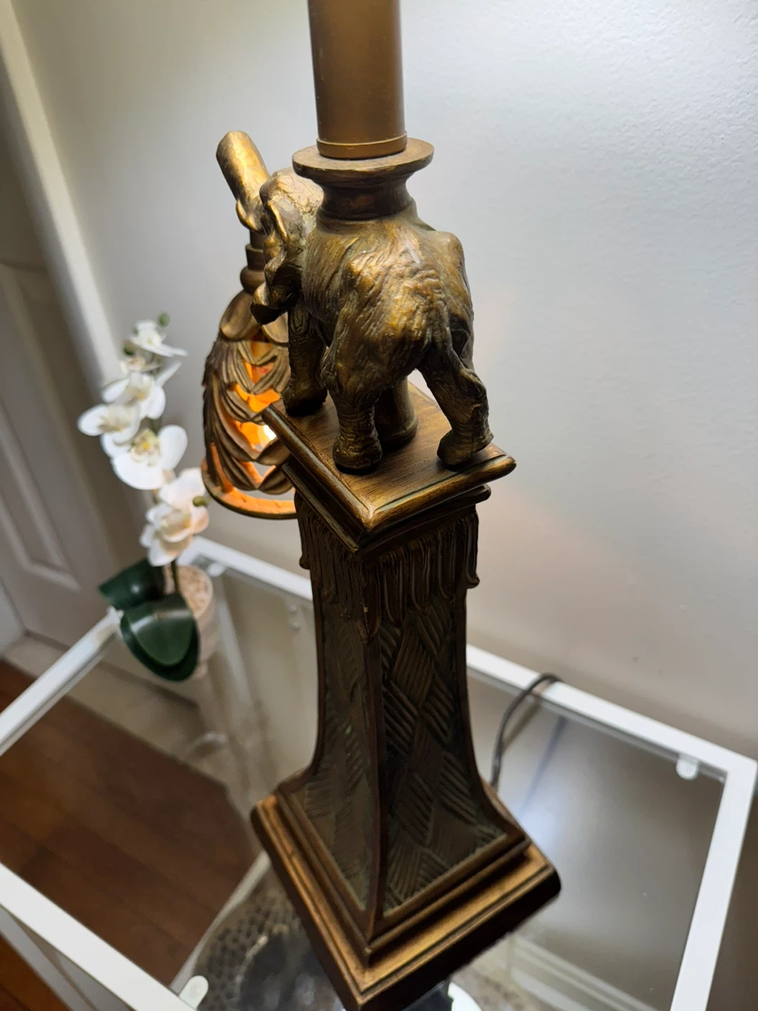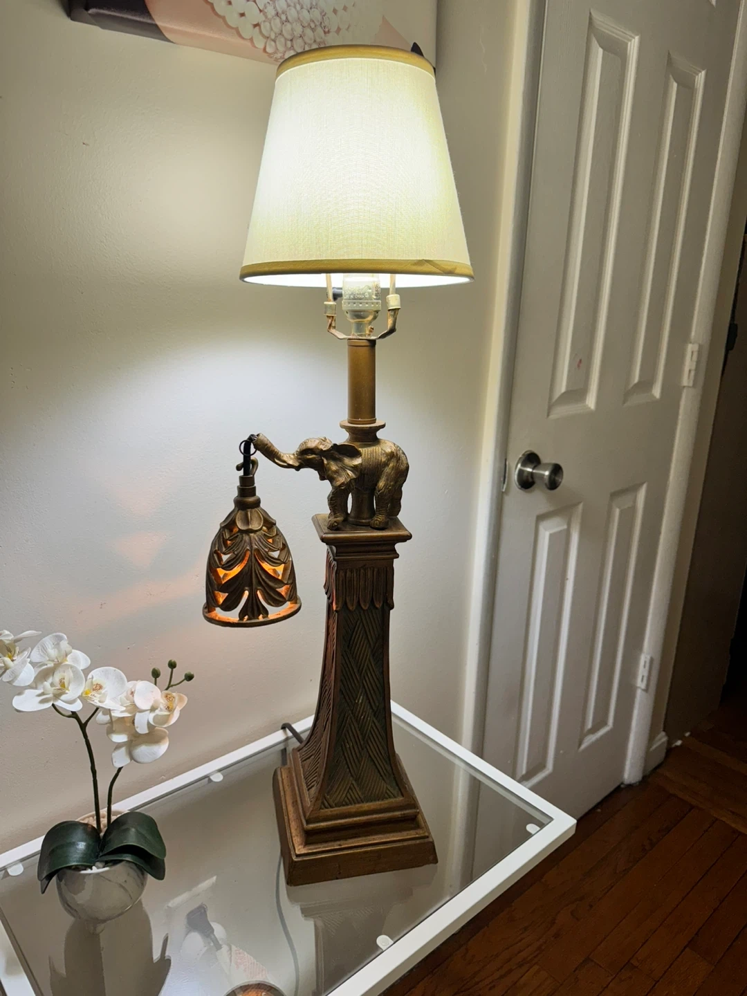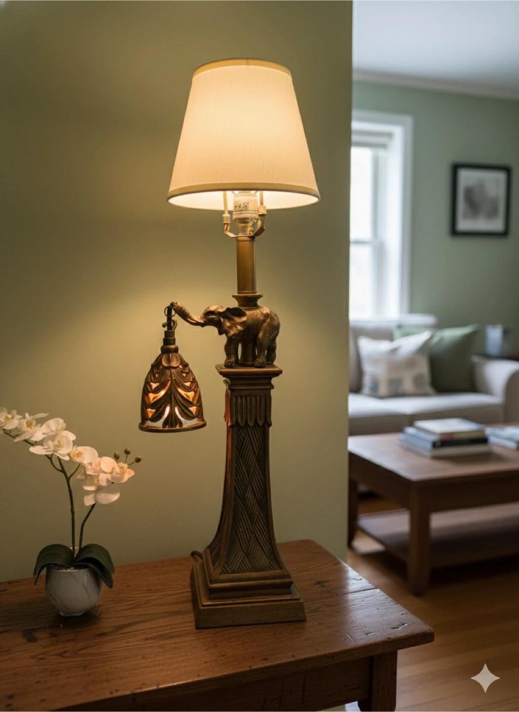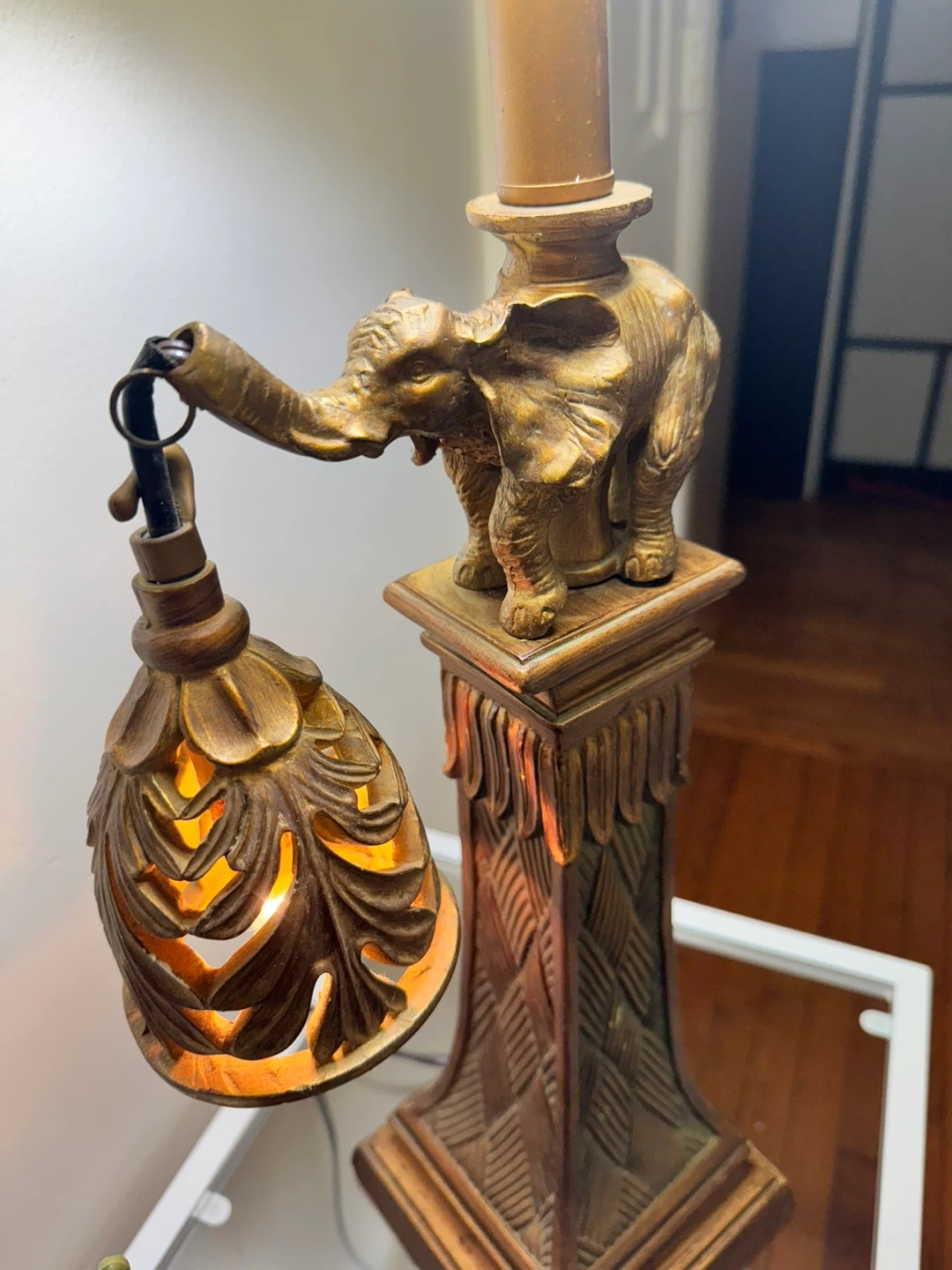 Check out this unique elephant table lamp! It features a detailed elephant figure on the base and a decorative hanging light. It's a great accent piece for any room