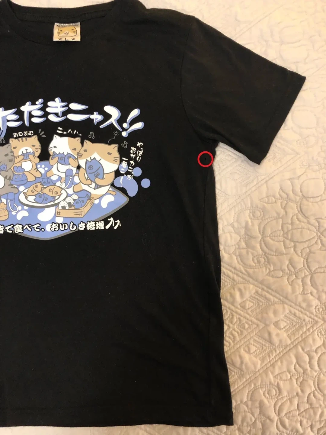 I'm selling a black Necobuchi-San t-shirt in size L and fits more like a M. It has a cute cat graphic on the front with no peeling. The material is 85% polyester and 15% cotton. There is a tiny hole near armpit.