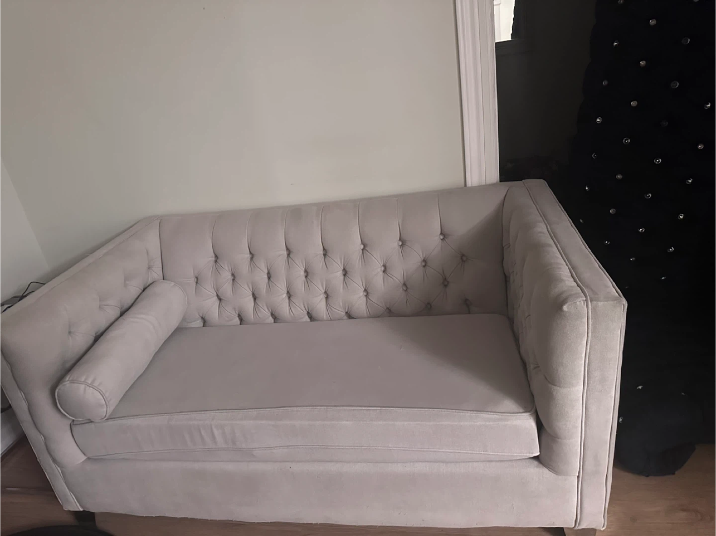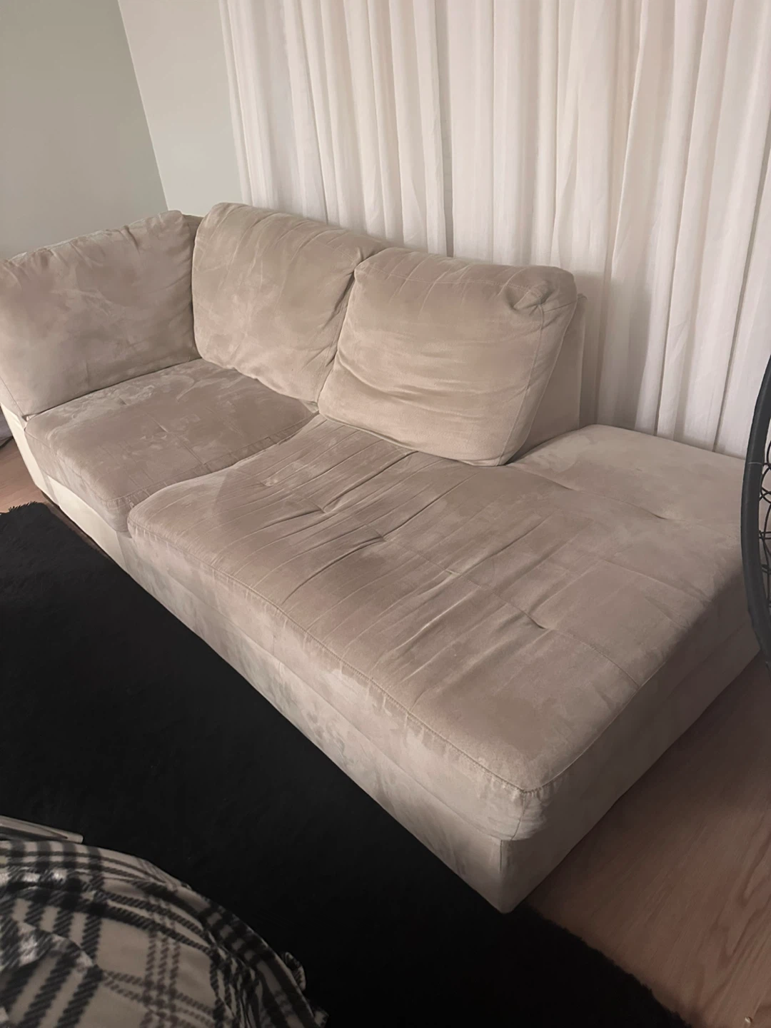 Selling a comfy beige sectional sofa. It's in good condition and ready for a new home. Perfect for lounging and relaxing in your living room!