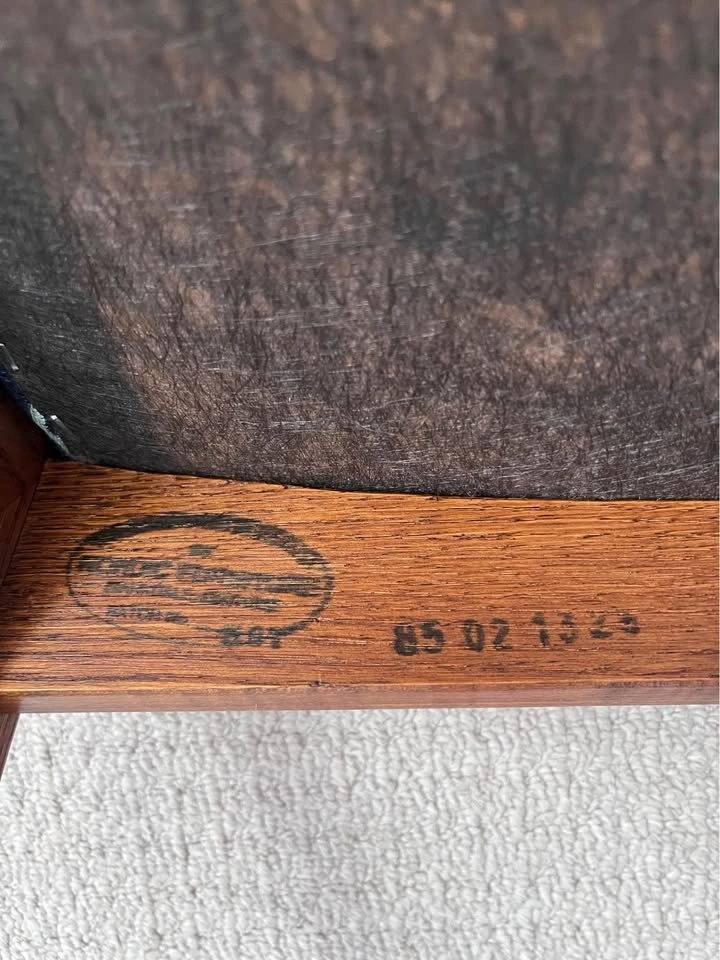 Beautiful a pair of oak dining chairs. Recently restored and reupholstered to new fabric. Canadian made and made by Nordic Furniture . Manufacturing serial numbers are stamped in the chair. Wood are excellent condition