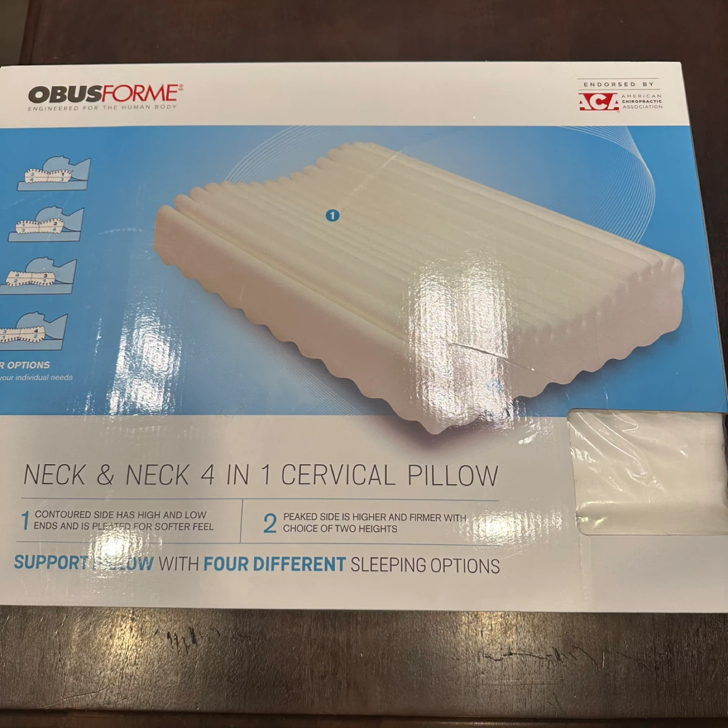 Selling an ObusForme Neck & Neck 4 in 1 Cervical Pillow! It's designed to support your neck with four different sleeping options. The pillow has a contoured side and a peaked side, each offering a different height and firmness. It comes in its original box