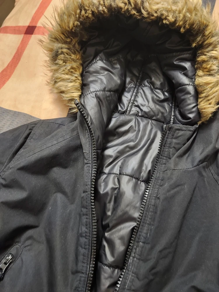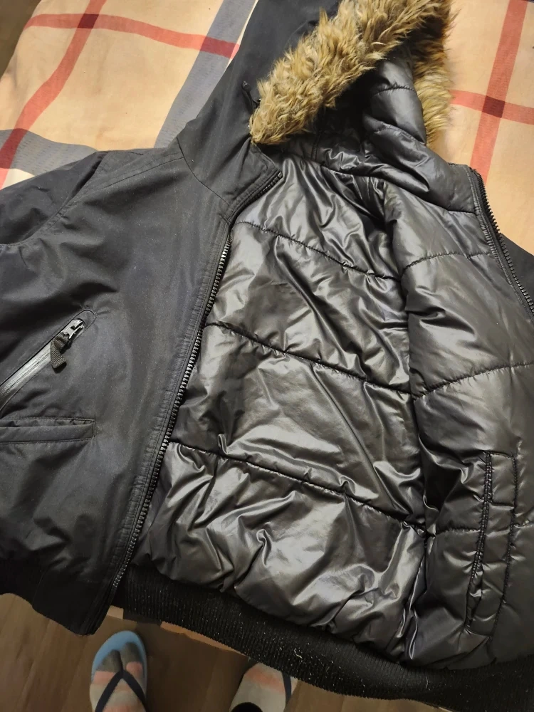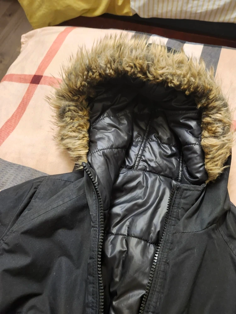 Here's a black winter jacket with a fur-trimmed hood. It's in good condition and perfect for the cold weather!