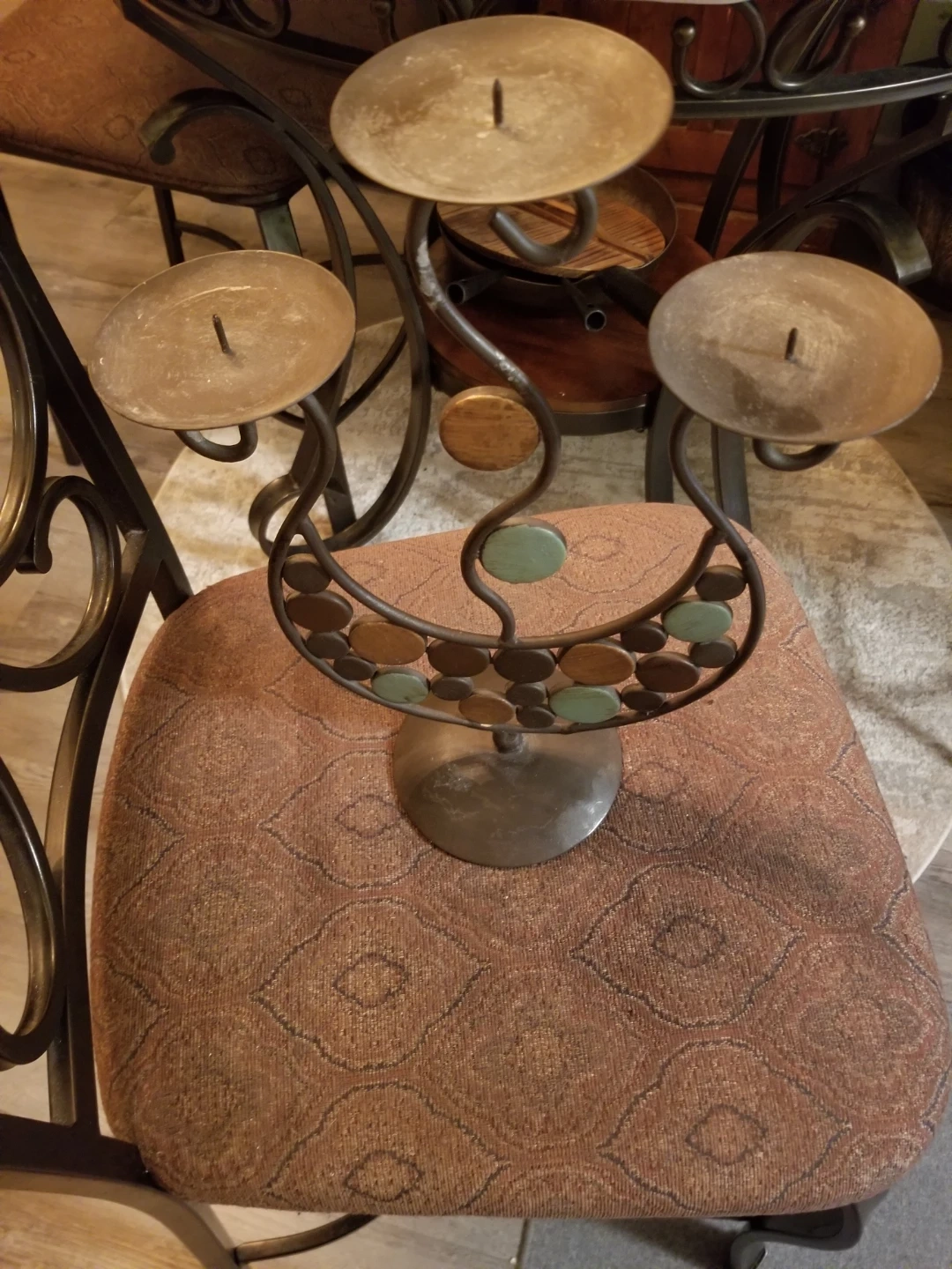 Selling this decorative , wrought iron candle holder. It holds 3 candles and has a splash of light green and gold colour throughout the base. It would compliment any space year round.