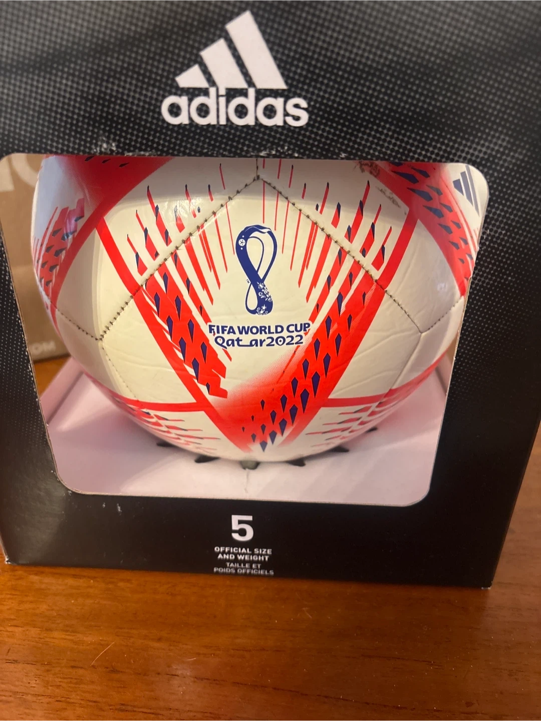 Selling an Adidas Al Rihla Club soccer ball, size 5! It comes with the original box and a shopping bag. It's an official size and weight ball, perfect for soccer enthusiasts