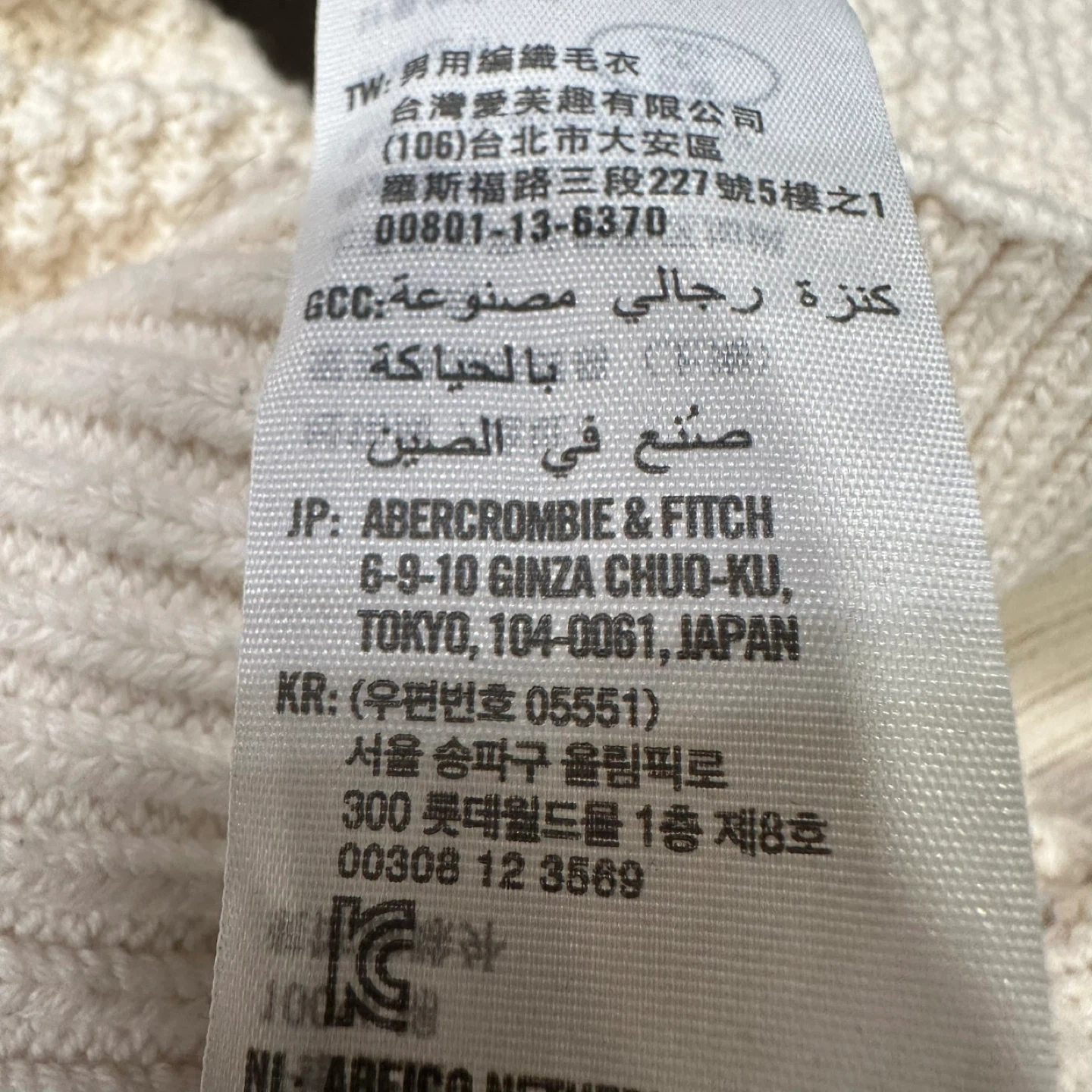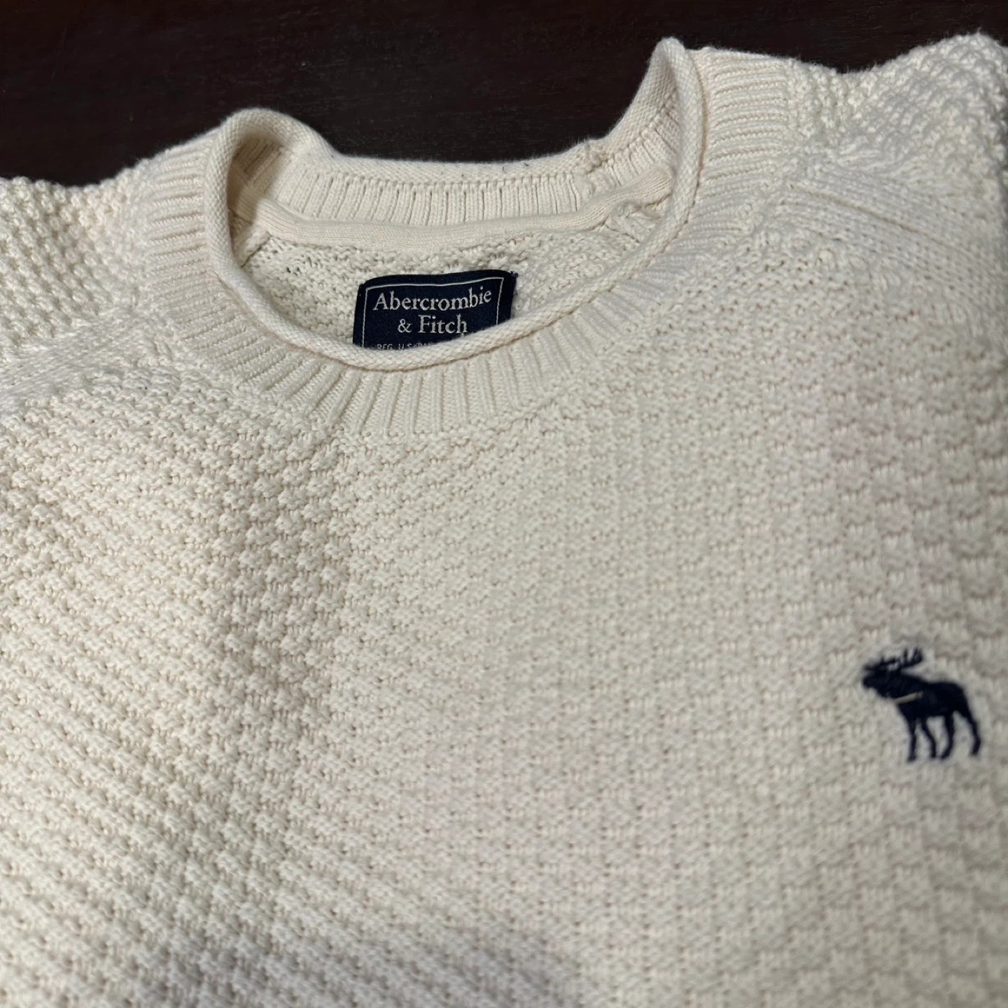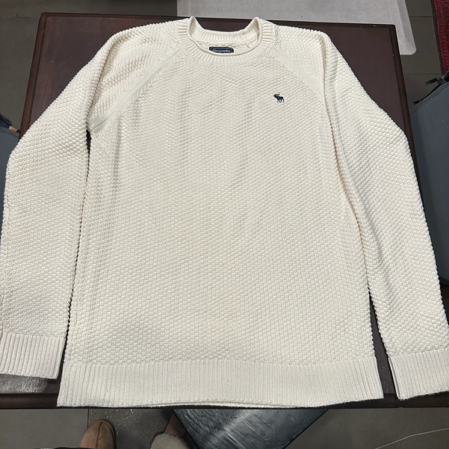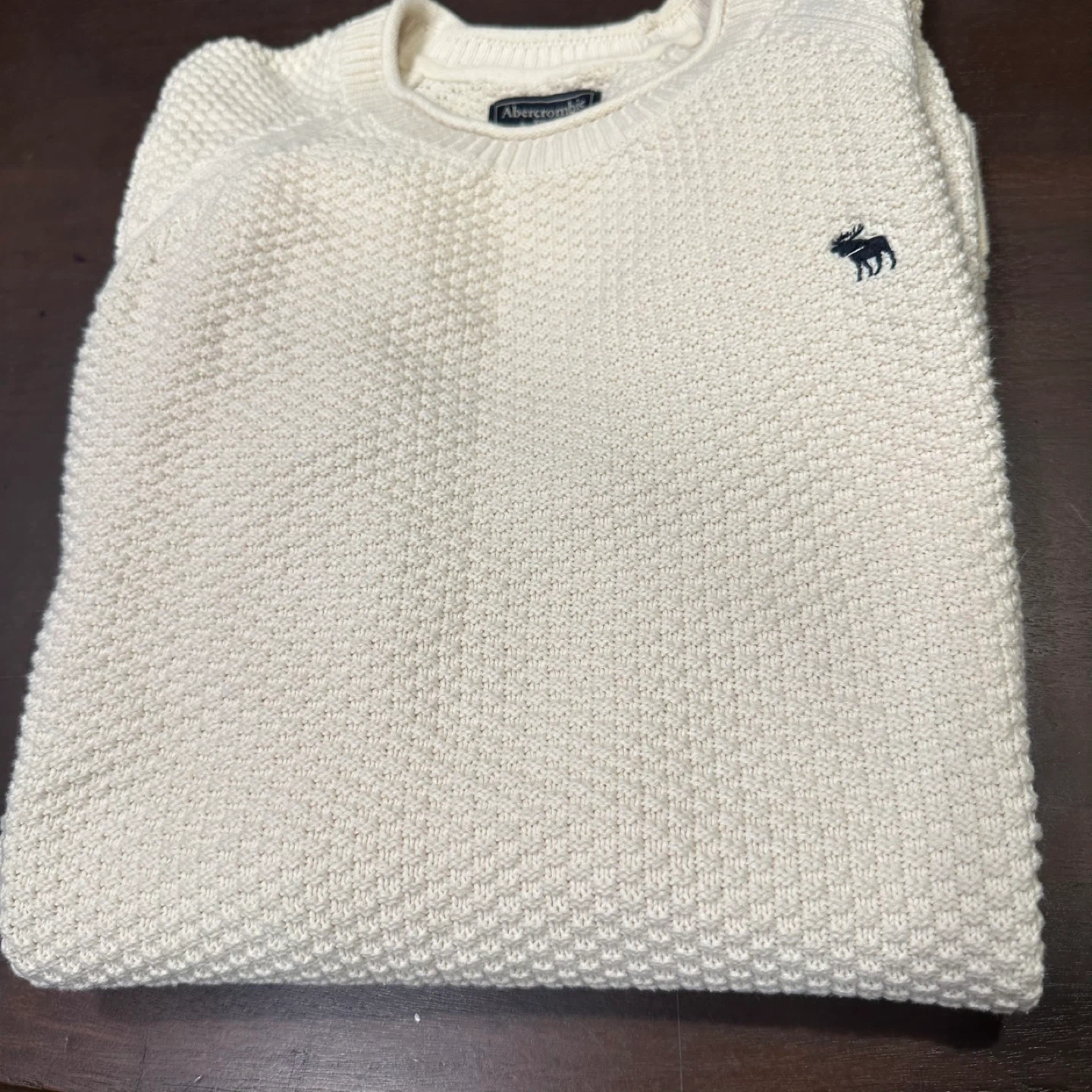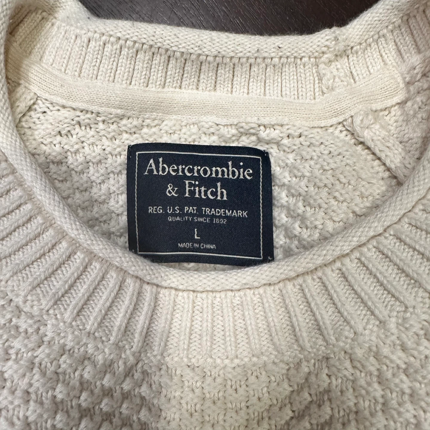 Here's a lovely cream-coloured sweater from Abercrombie & Fitch! It's a size large and made from 100% cotton. Perfect for layering or wearing on its own