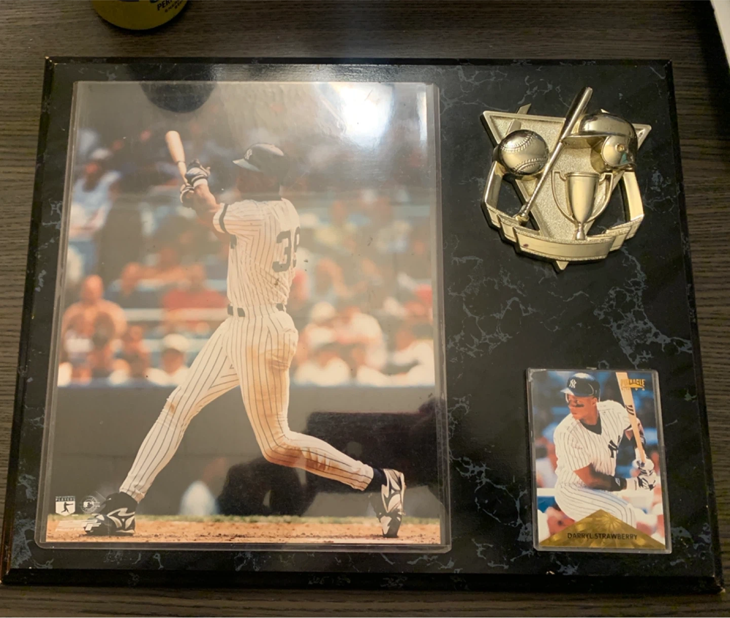 Selling a framed plaque featuring Darryl Strawberry! This piece includes a photo of Strawberry in action, a baseball card, and a decorative emblem. It's a cool collectible for any baseball fan or memorabilia collector