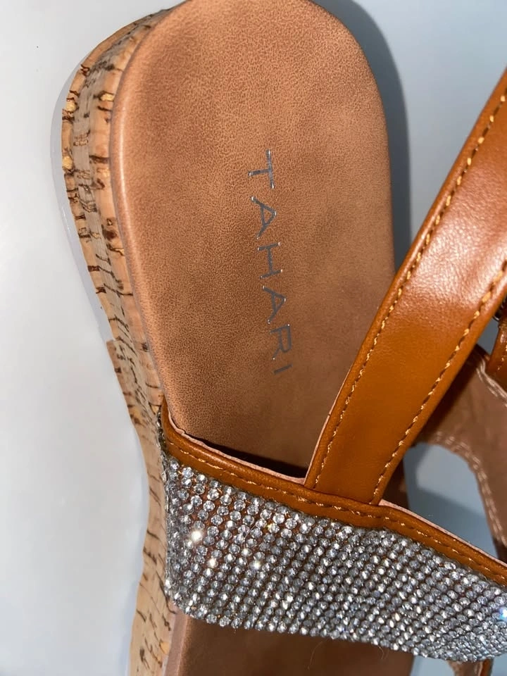 Gorgeous Tahari rhinestone platform sandals — brand new with tags. Super sparkly straps, comfy cushioned footbed, and a cork-style platform sole. Perfect for summer, events, parties, or adding a little glam to any outfit.