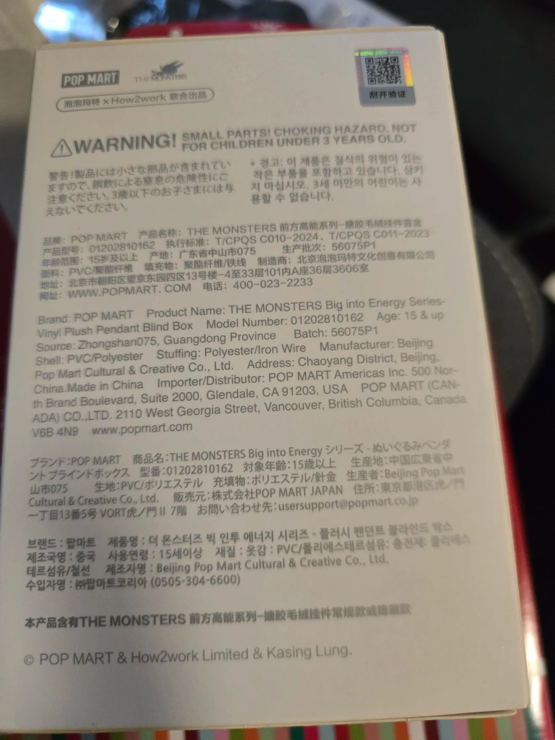 Selling a Pop Mart Purple color The Monsters Big Into Energy series vinyl plush pendant blind box! This is suitable for ages 15 and up, and comes in its original box