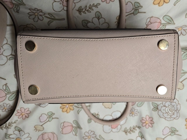 This genuine Michael Kors satchel purse in pale pink Saffiano leather is stylish, structured, and perfect for any occasion. It features gold-tone hardware, protective bottom studs, dual top handles, and a detachable crossbody strap. With multiple compartments, it’s designed for both beauty and function.