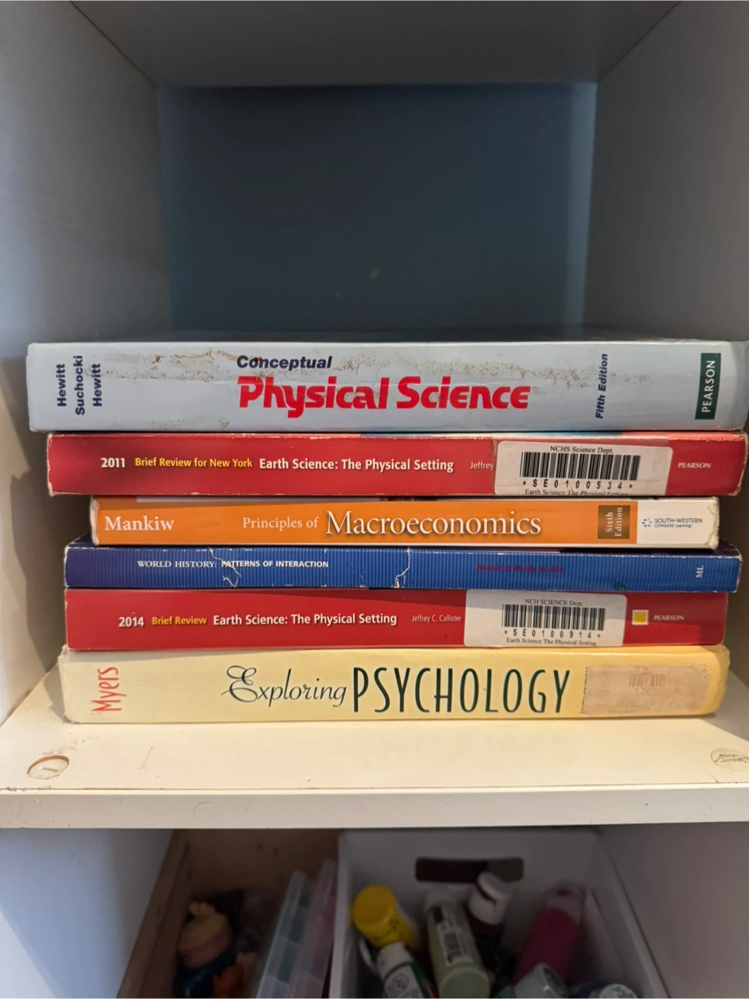 Selling a collection of college textbooks! Includes: - Conceptual Physical Science, Fifth Edition - Brief Review for New York Earth Science: The Physical Setting (2011 and 2014 editions) - Principles of Macroeconomics, Sixth Edition - World History: Patterns of Interaction - Exploring Psychology