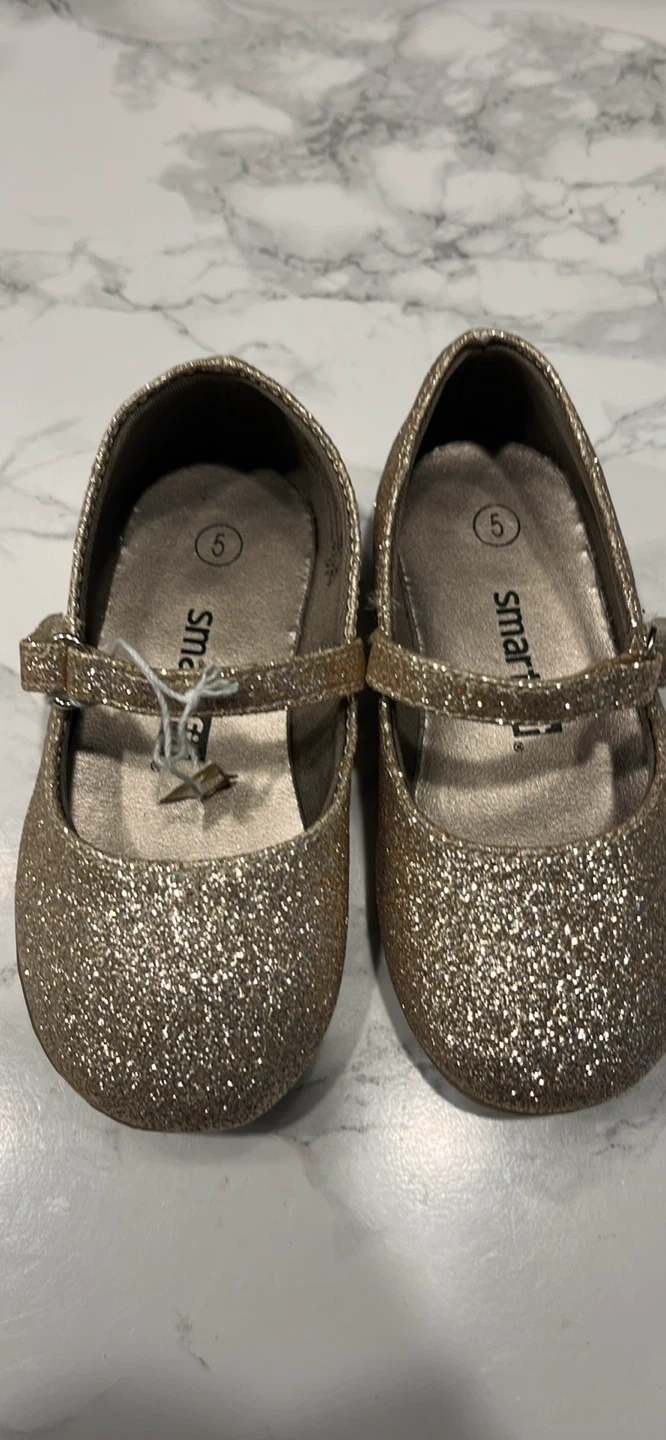 These adorable Smartfit Mary Janes are perfect for your little one! They're a size 5 and feature a sparkly glitter finish that's sure to catch the eye. The shoes are in great condition and come with their original box. They have skid-resistant soles for added safety