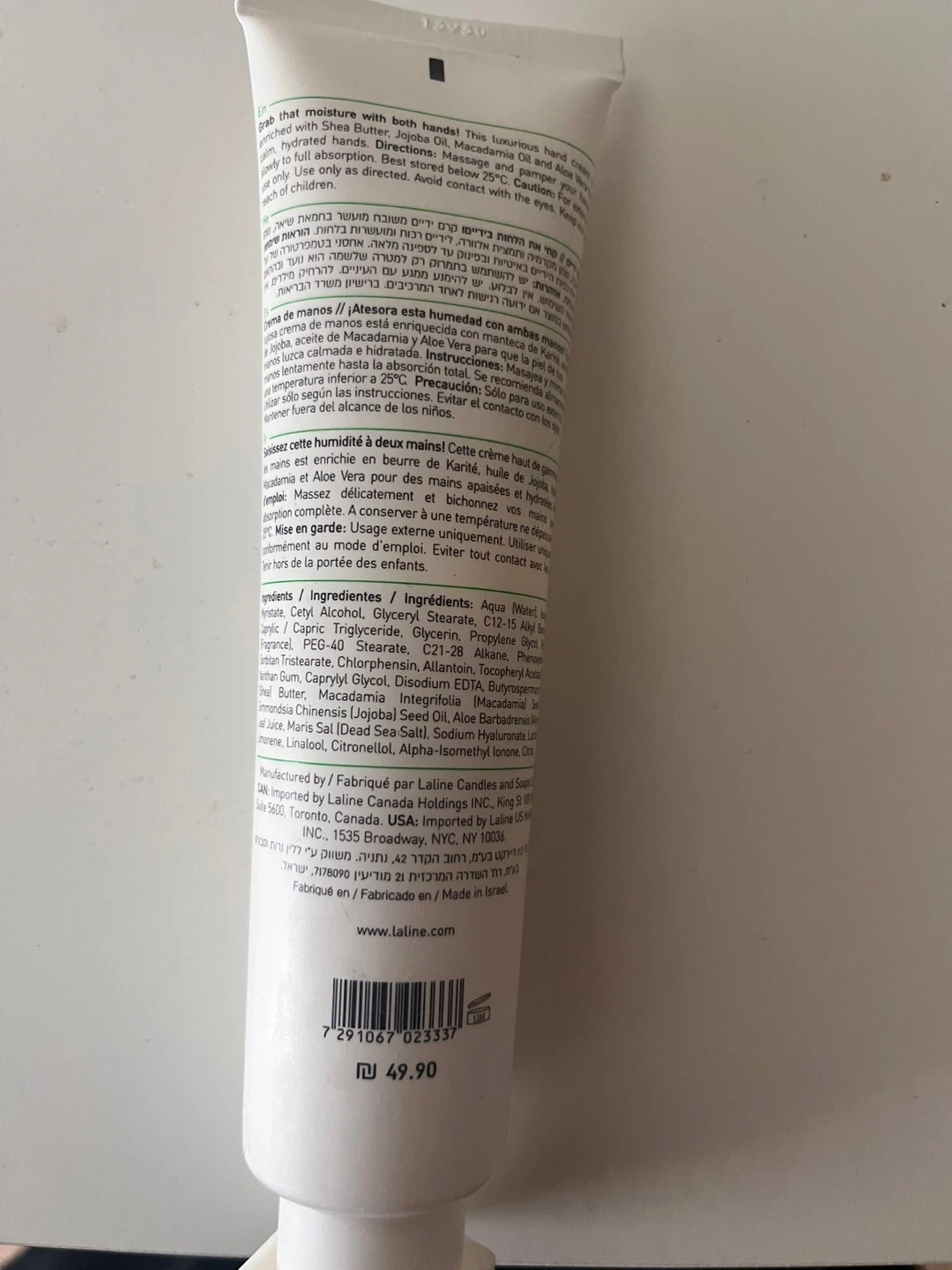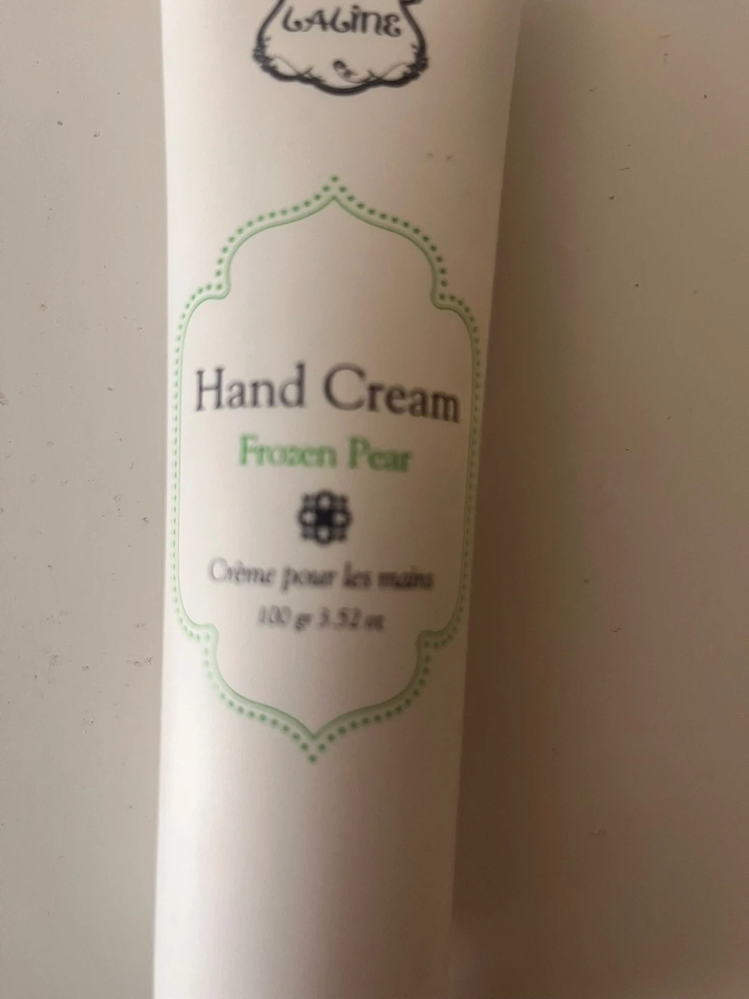 Selling a tube of Laline hand cream in the Frozen Pear scent! It contains 100g / 3.52 oz of product. It's a luxurious hand cream enriched with shea butter, macadamia oil, jojoba oil, and Dead Sea salt to keep your hands moisturized