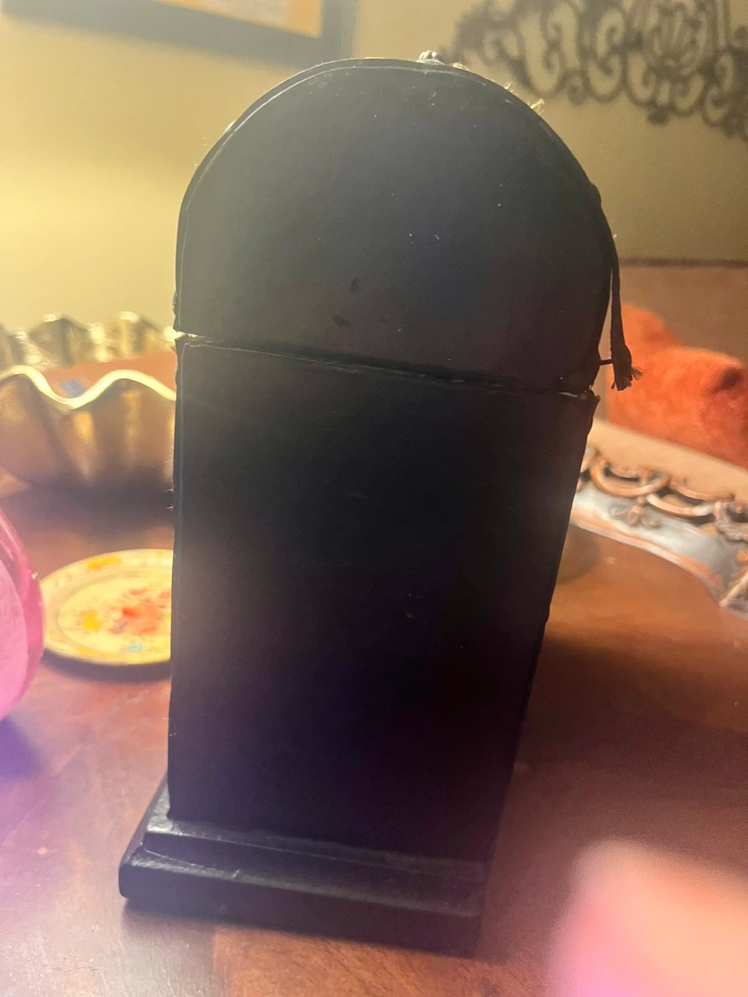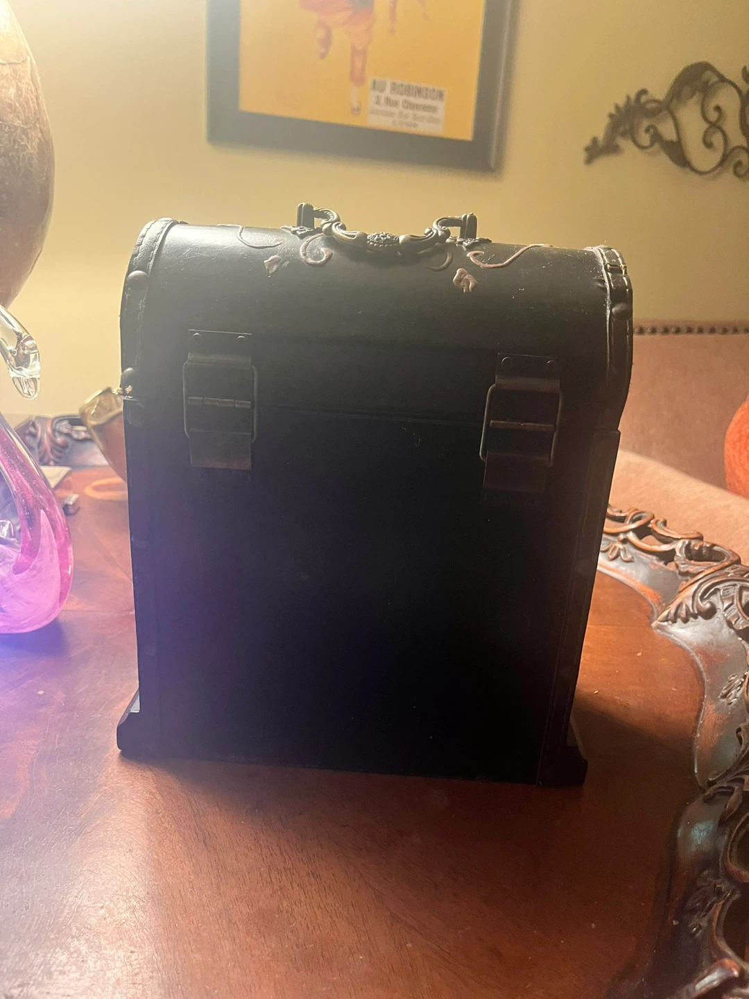 Selling a decorative treasure chest clock. It's black with gold accents and has a functional clock on the front. Perfect for adding a unique touch to your home decor!