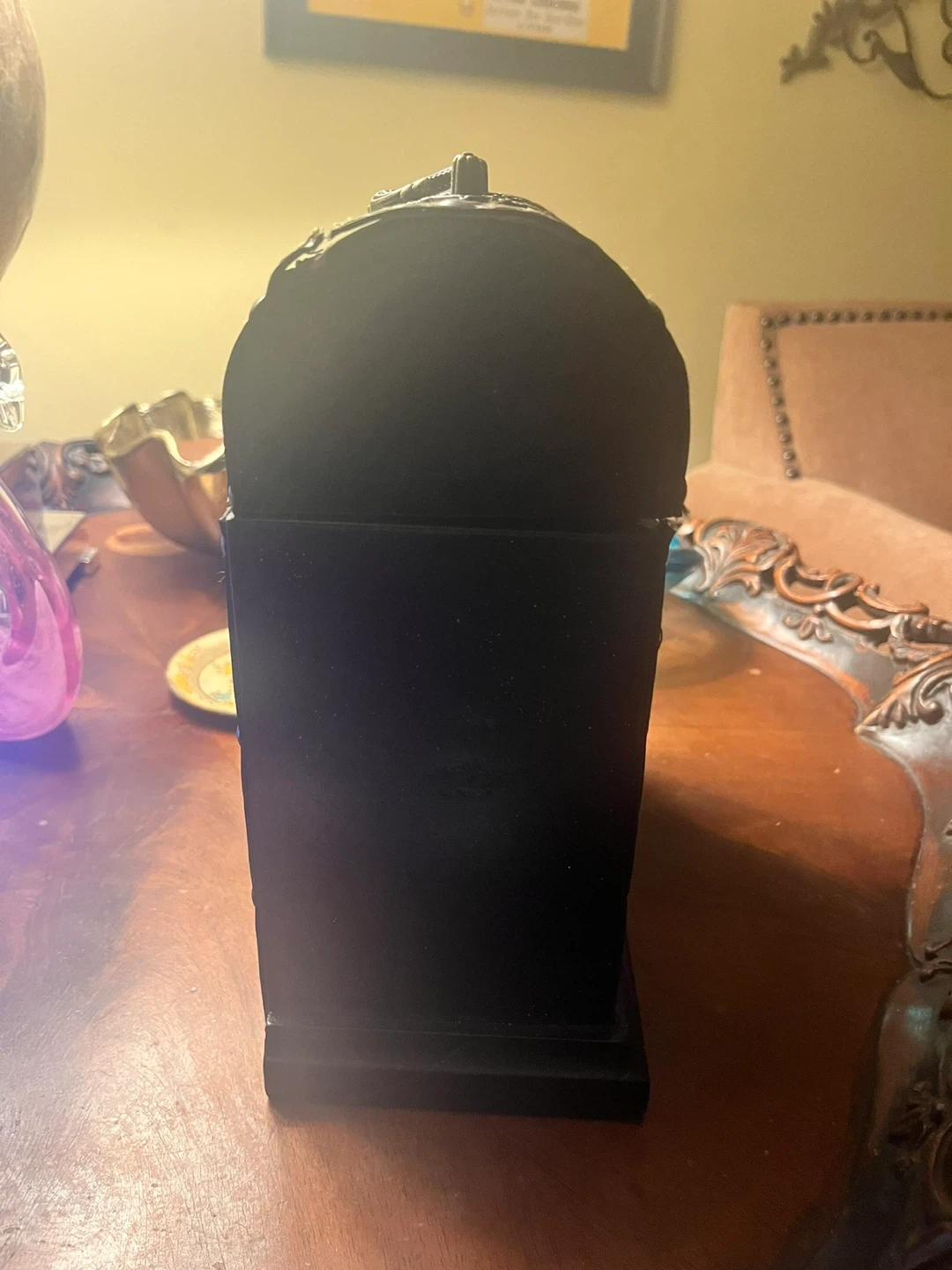 Selling a decorative treasure chest clock. It's black with gold accents and has a functional clock on the front. Perfect for adding a unique touch to your home decor!
