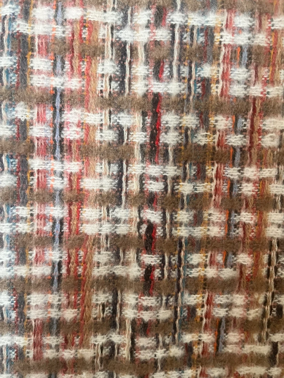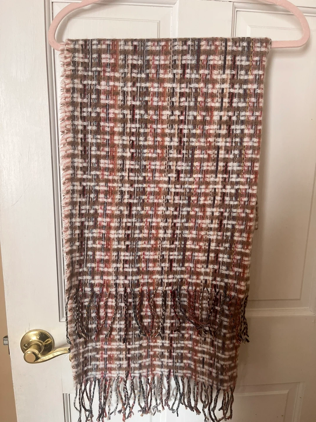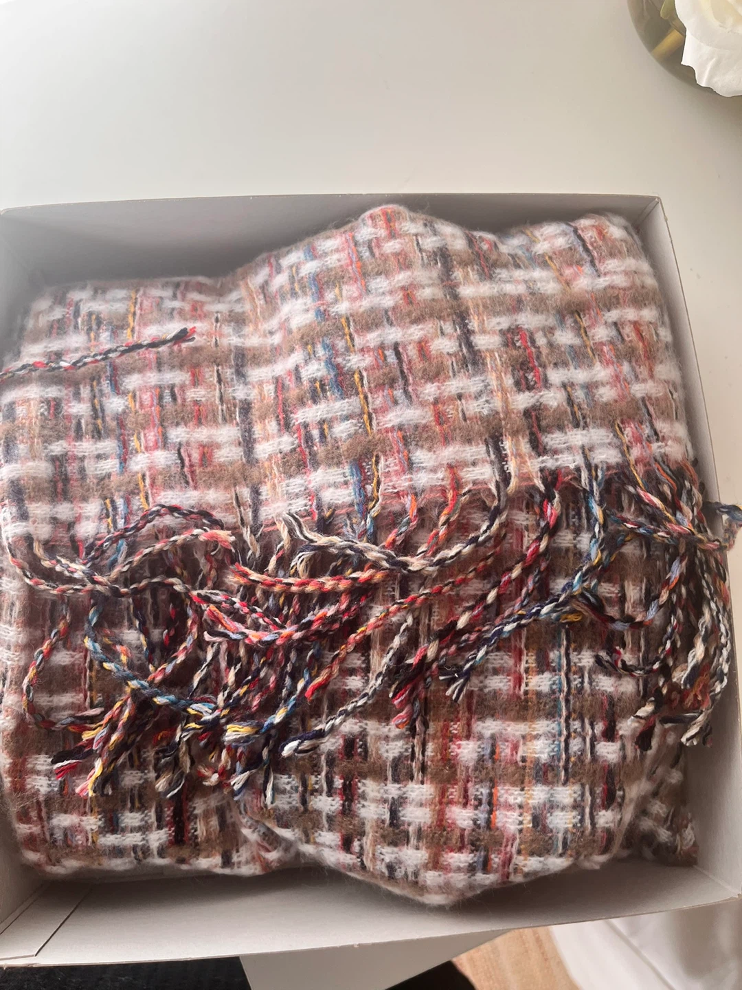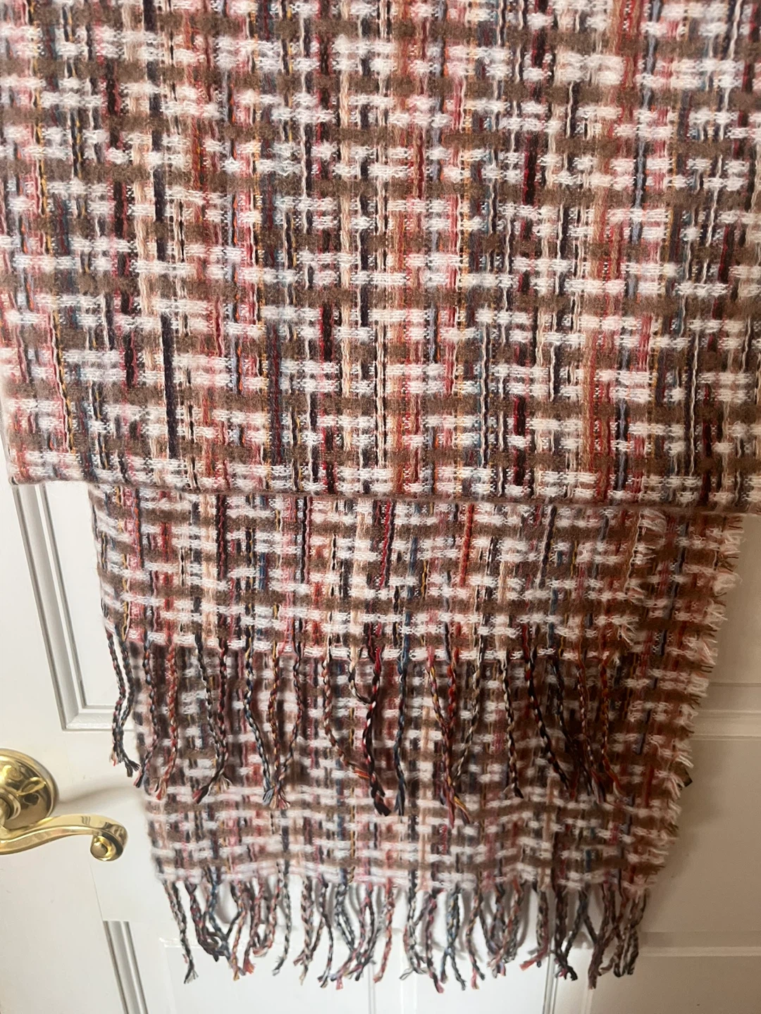 This is a lovely woven scarf with tassels. It features a beautiful pattern in shades of brown, white, red, and blue. The scarf is in great condition and comes with its original box. Perfect for adding a touch of warmth and style to any outfit!