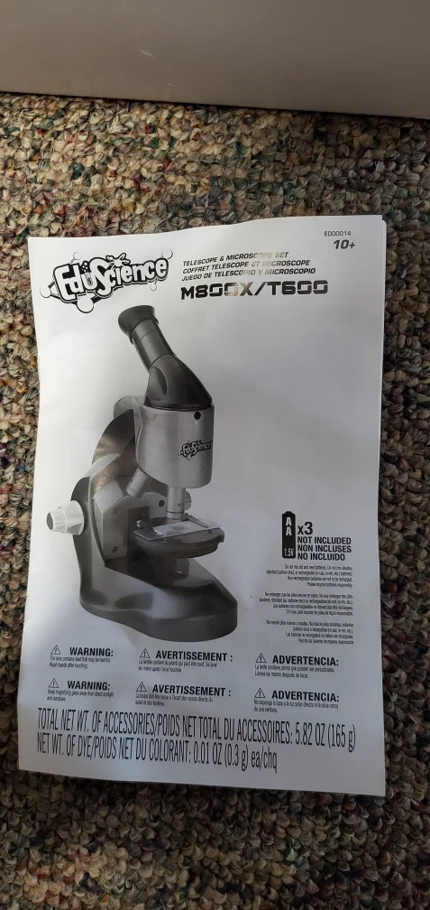 I'm selling an Edu Science Telescope & Microscope Set (M800X/T600) from Toys r Us. Never used, still has all the pieces still in their original packaging.