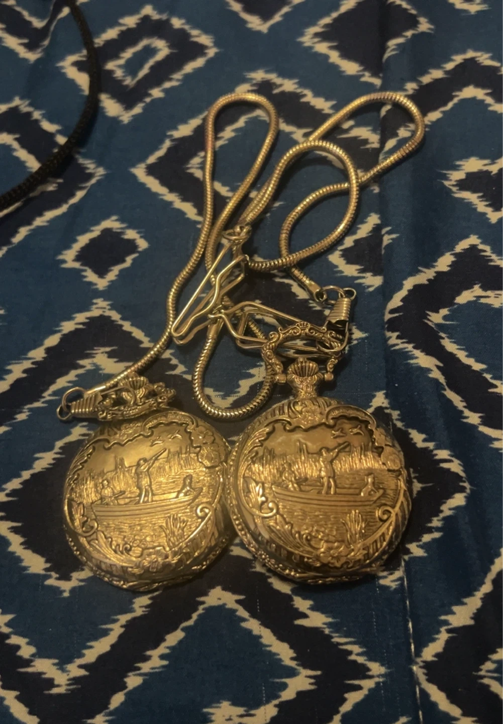 Selling a set of two vintage-style pocket watches. They feature intricate designs and come with chains. They’re not in working condition I believe.