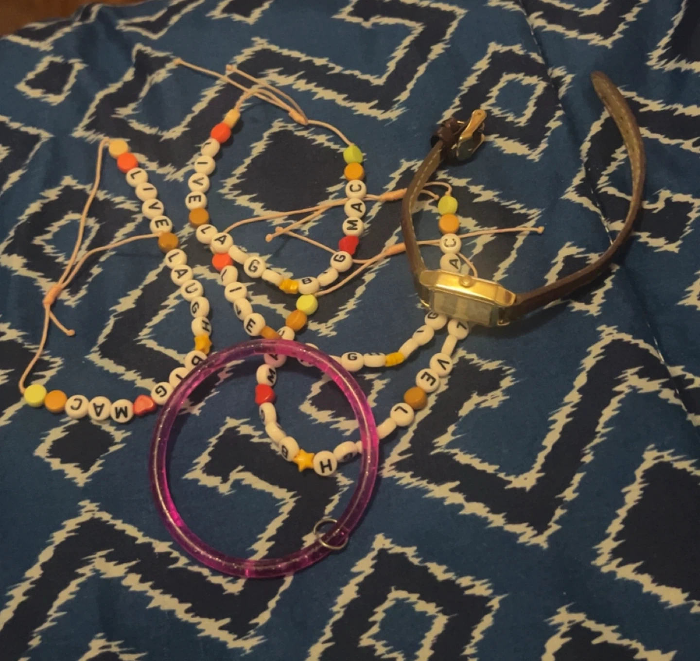 Selling a collection of fun beaded bracelets, including some with the words 'Live Laugh' and 'Mac'. Watch doesn’t work!