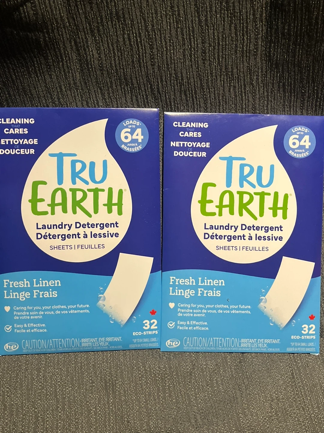 Selling two boxes of Tru Earth Laundry Detergent Sheets in Fresh Linen scent! Each box contains 32 eco-strips, good for 64 loads. These are easy and effective for cleaning your clothes while being gentle on the environment. Caring for your clothes, your future