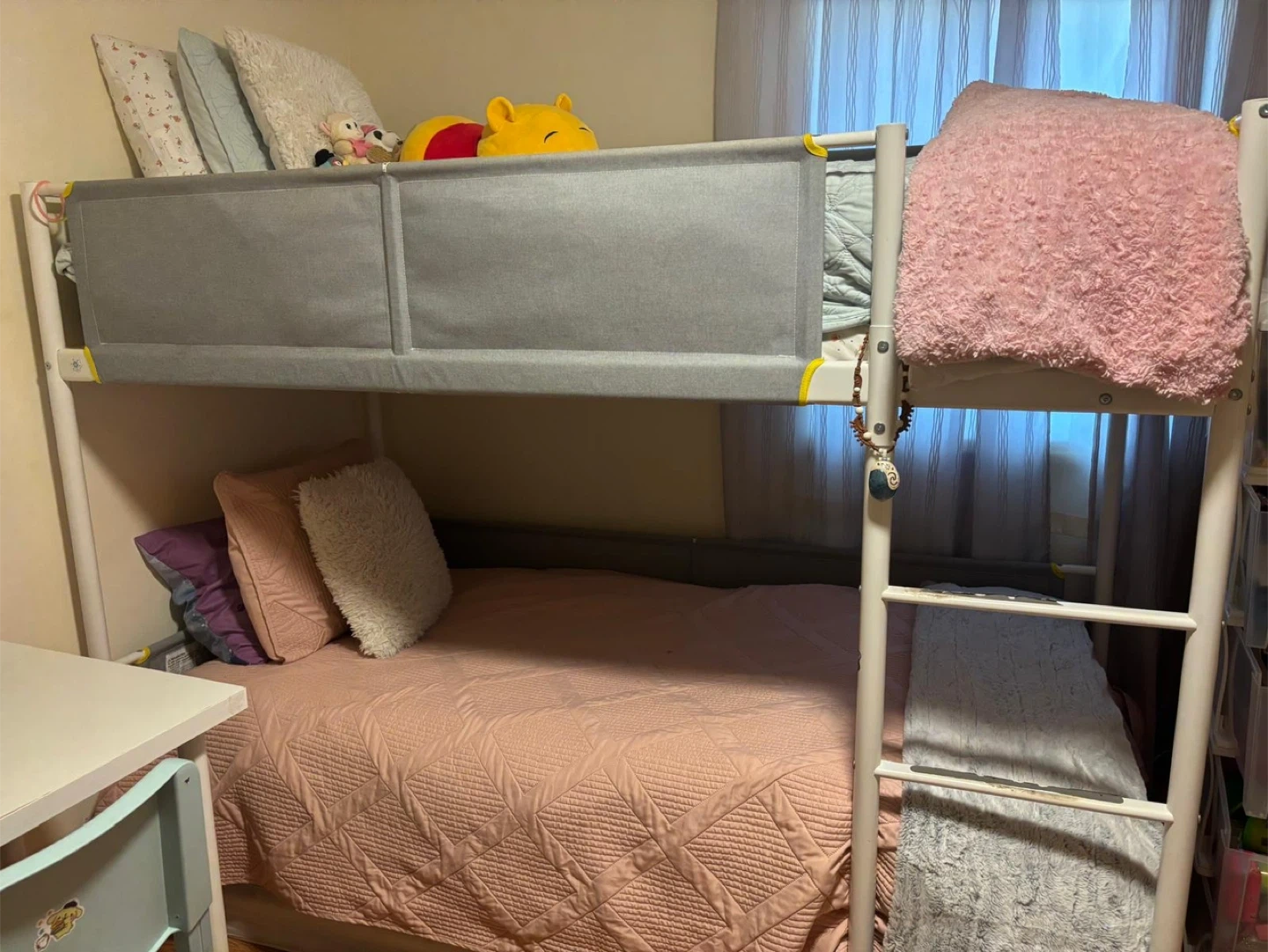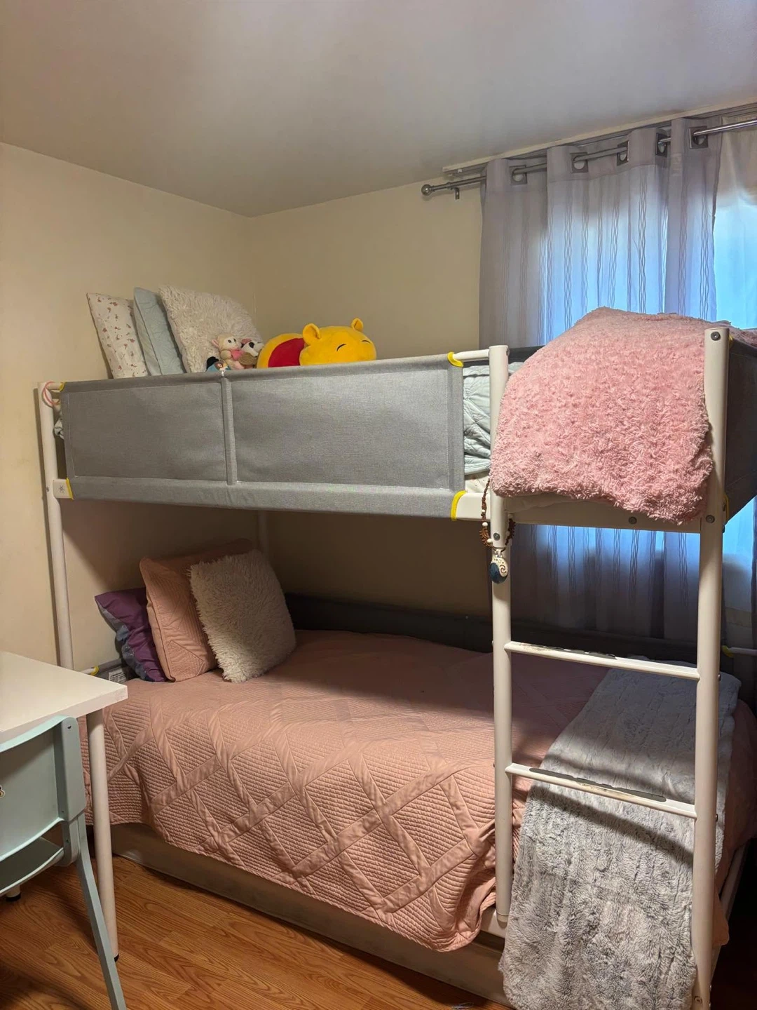 Selling a twin size bunk bed with a white frame! It's in great condition and perfect for saving space in a shared room or guest room. The ladder makes it easy to climb up to the top bunk.