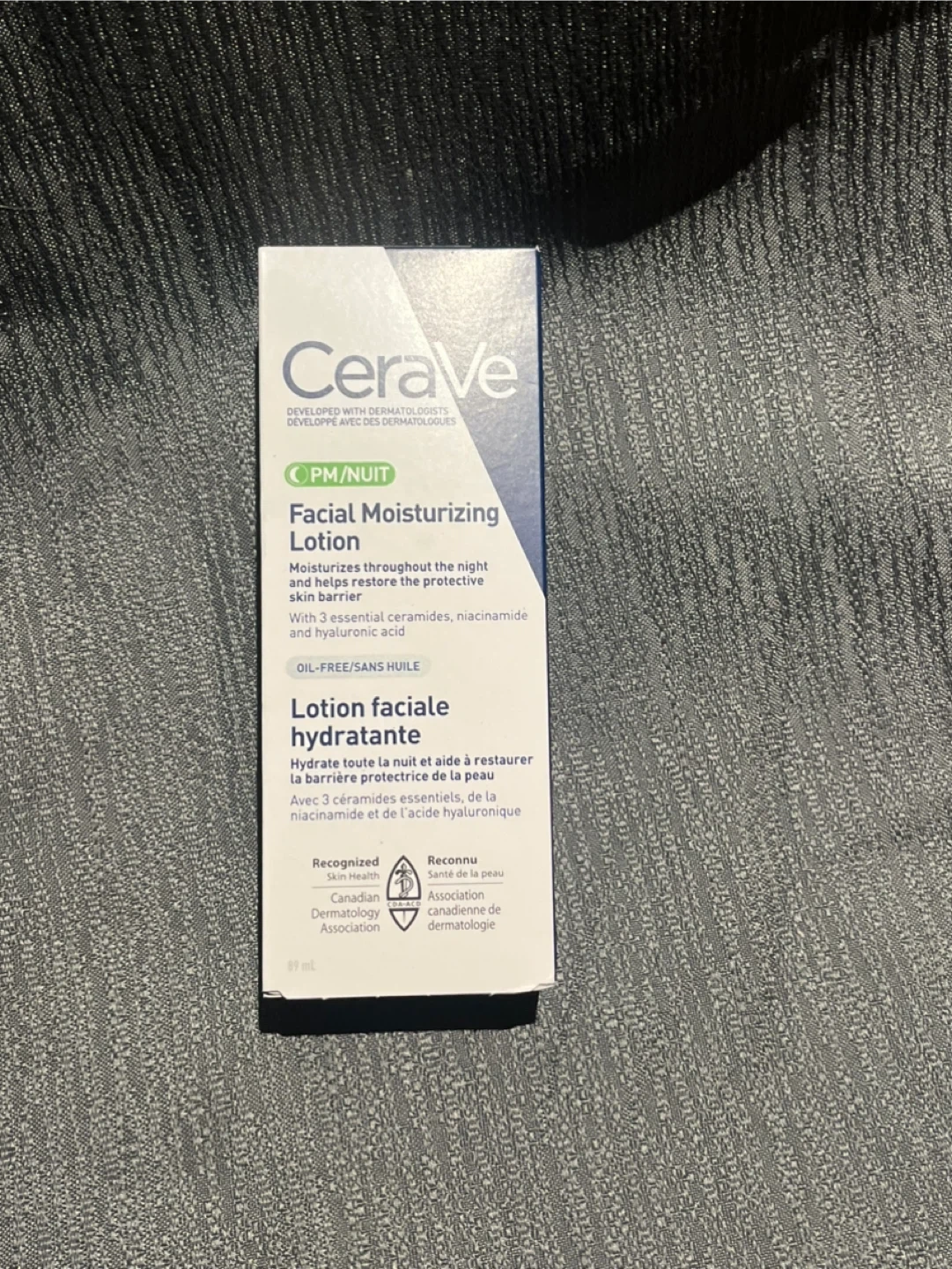 Selling a bottle of CeraVe PM Facial Moisturizing Lotion. It moisturizes throughout the night and helps to restore the protective skin barrier. It's oil-free and contains 3 essential ceramides, niacinamide, and hyaluronic acid.