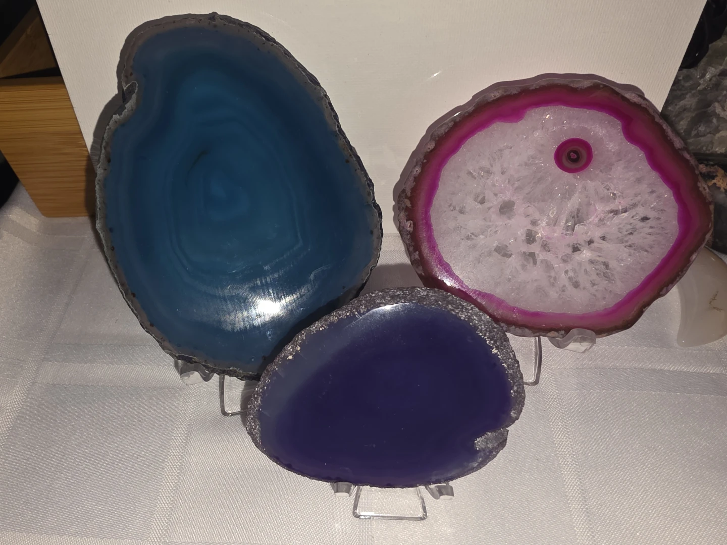 Selling a set of three beautiful agate slices! They come in blue, purple, and pink. Great for decoration or as part of a collection. From my personal collection. Pickup is near High Park Station in my building.