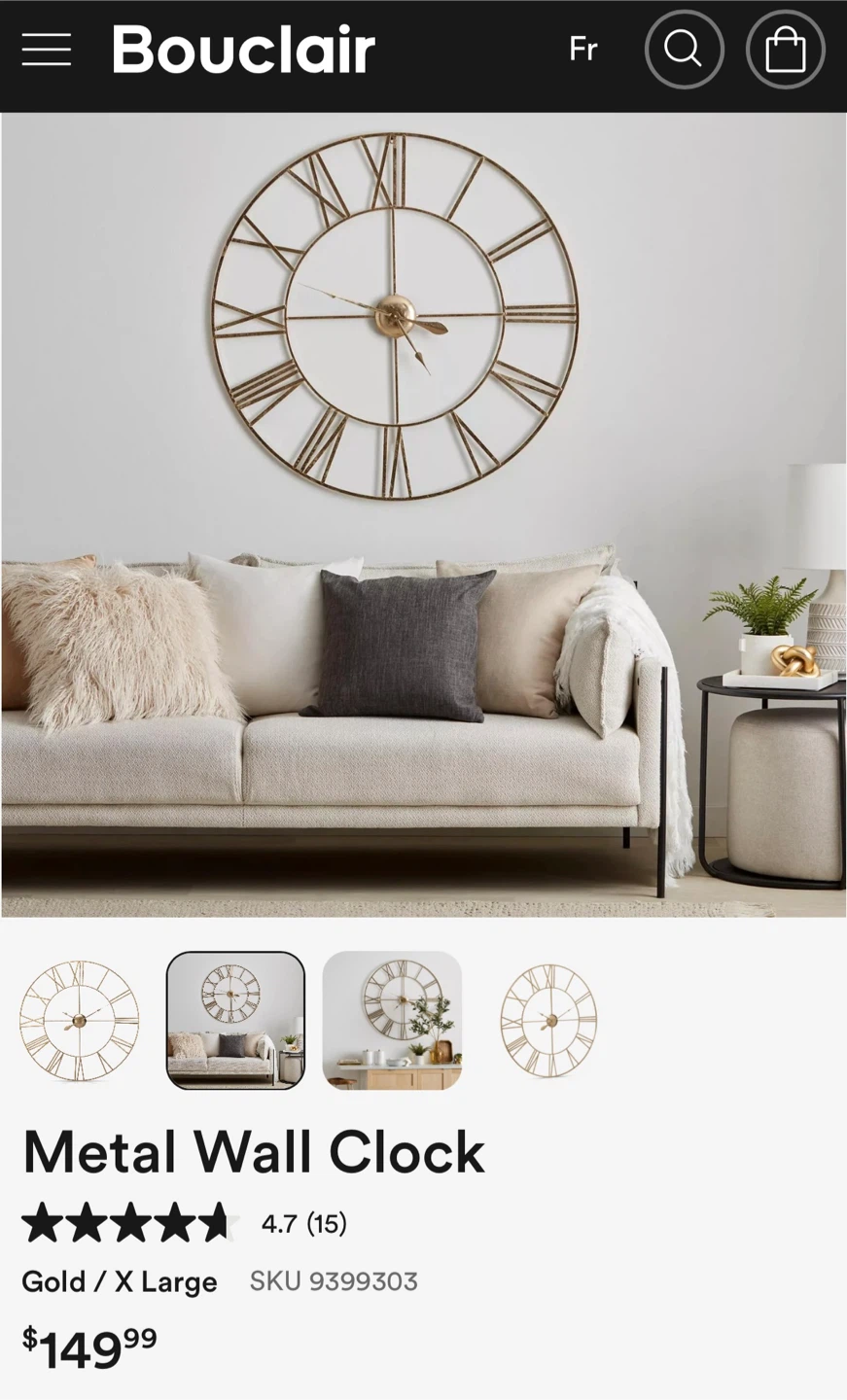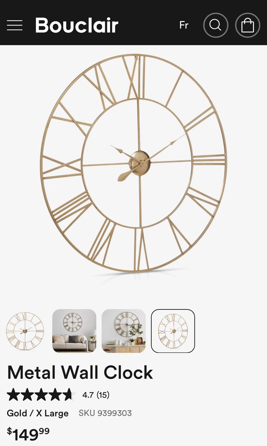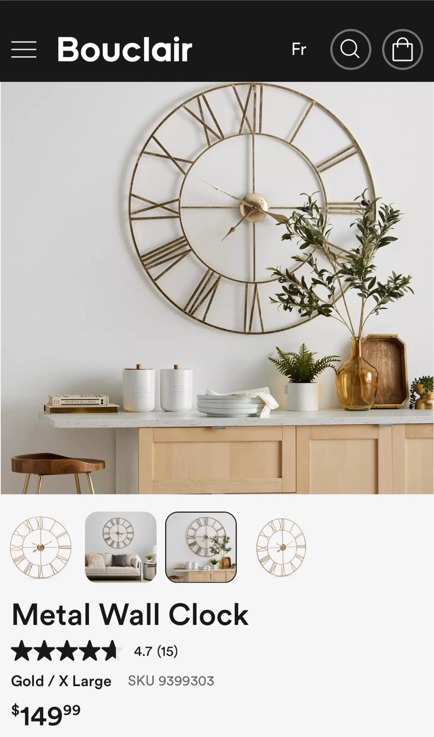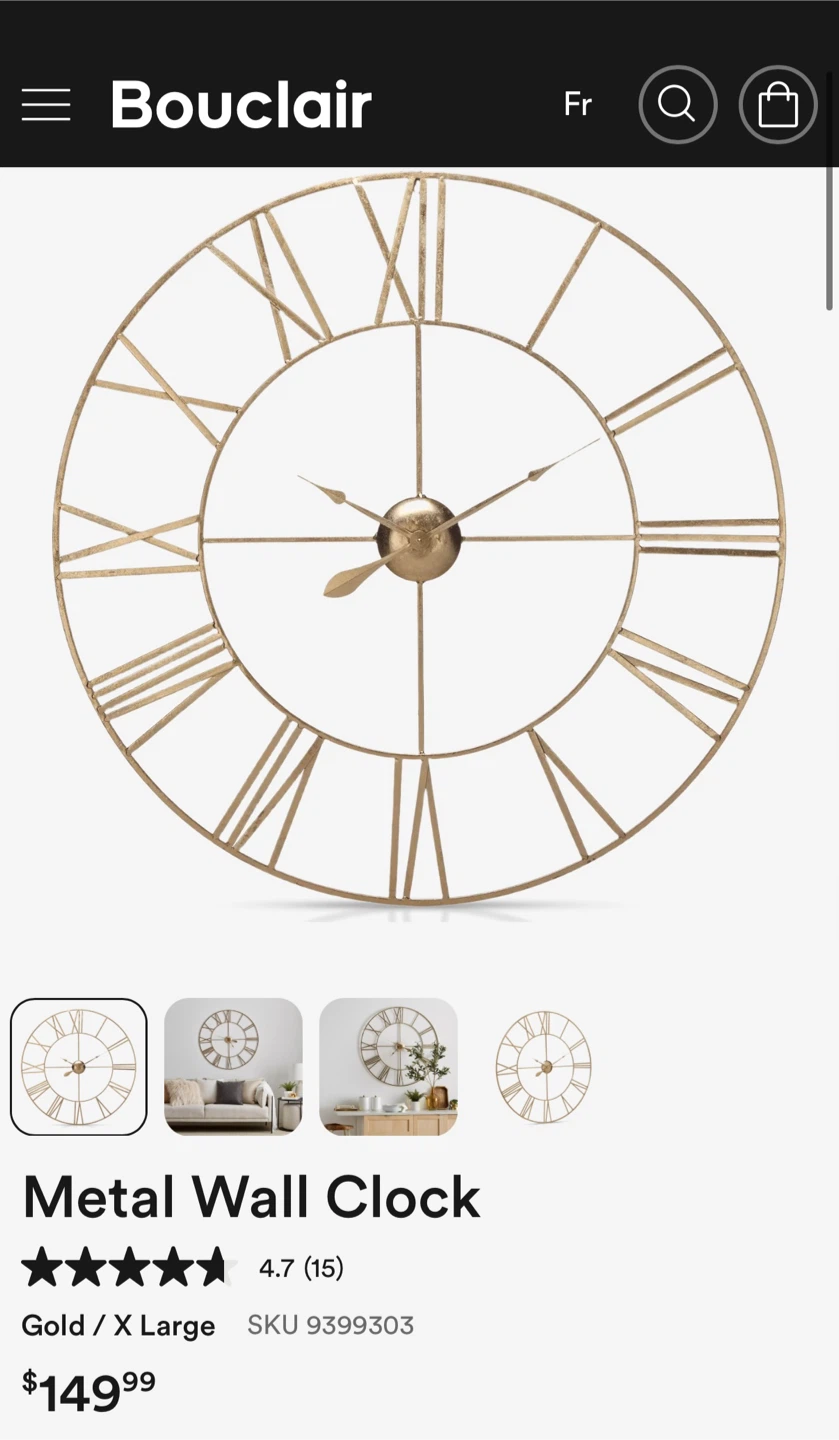 Add a touch of elegance to your home with this Bouclair metal wall clock! It features a beautiful gold finish and an extra-large size that makes a statement. Originally bought for $149.99 plus tax. BRAND NEW STILL IN BOX.