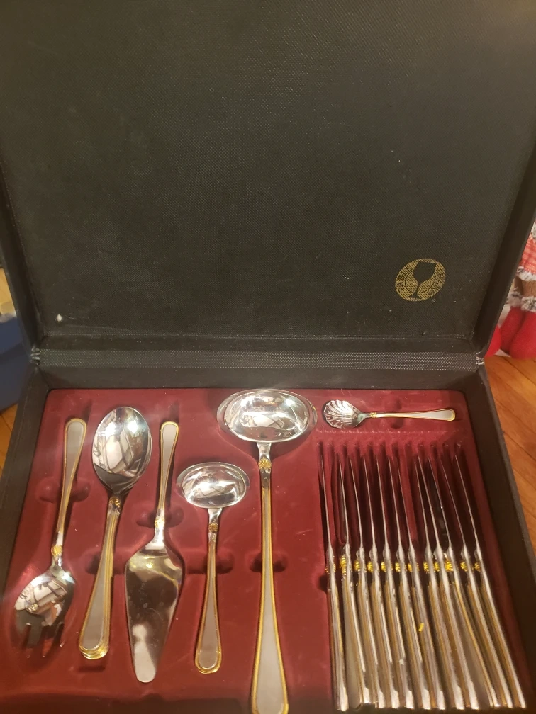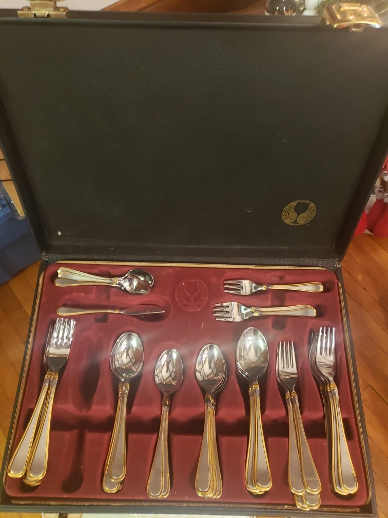 Selling a vintage flatware set with gold accents! It comes in a box and includes various spoons, knives, and forks. Perfect for adding a touch of elegance to your dining experience. Table charm stainless steel with gold electrode.18/10.