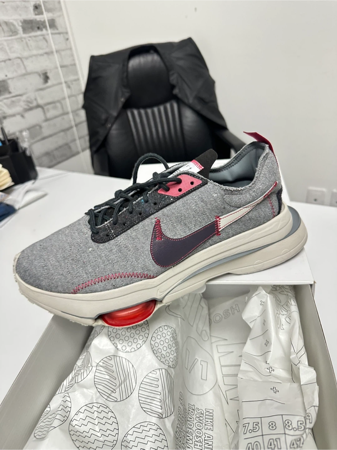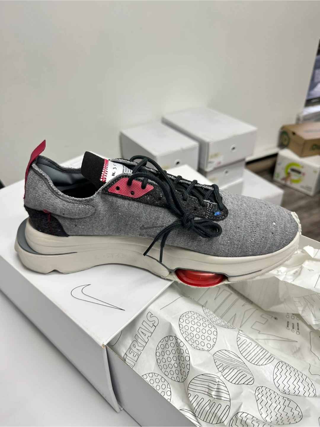 Nike By Julian N354 sneakers, size 12.5. This is a Nike Air Zoom Type sneaker in a grey, pink, black, and white colorway. The design features a deconstructed aesthetic with exposed stitching, stacked foam at the heel, and contrast-colored Zoom Air cushioning units visible in the forefoot. A TPU plate runs the length of the shoe for stability and comfort. Comes with the original box!