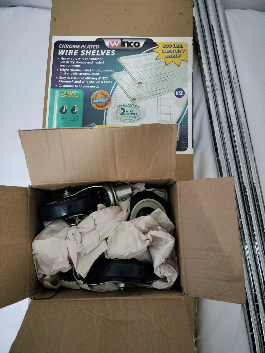 Selling Winco chrome plated wire shelves! These shelves feature heavy-duty wire construction, making them suitable for dry storage and heated environments. The bright chrome-plated finish helps reduce dust and dirt accumulation. Easy to assemble with Winco chrome plated wire shelves and posts, and you can customize them to fit your needs. Includes 2 wire shelves and sleeve clips. Seller has included a box of wheels and four post separately.