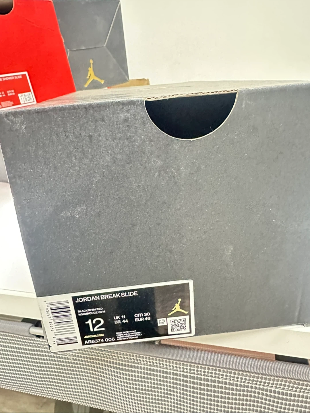 Selling a pair of Jordan Break Slides in size 12. The colour is black and gym red. They come with the original box! Perfect for wearing around the house or out and about