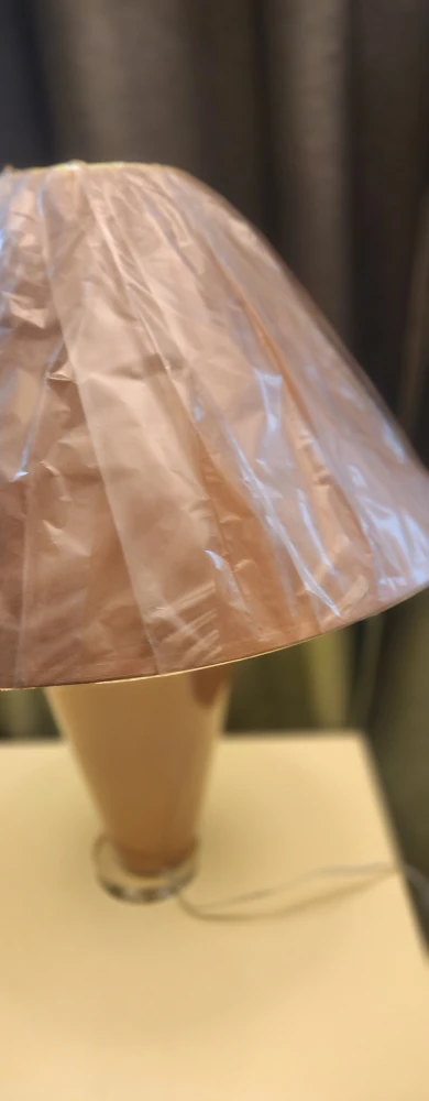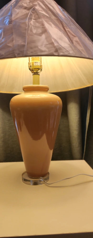 Selling a lovely peach-coloured table lamp! It has a unique vase-like shape and comes with a shade. It's in great condition and gives off a warm, cozy light. Perfect for a bedside table or living room accent.