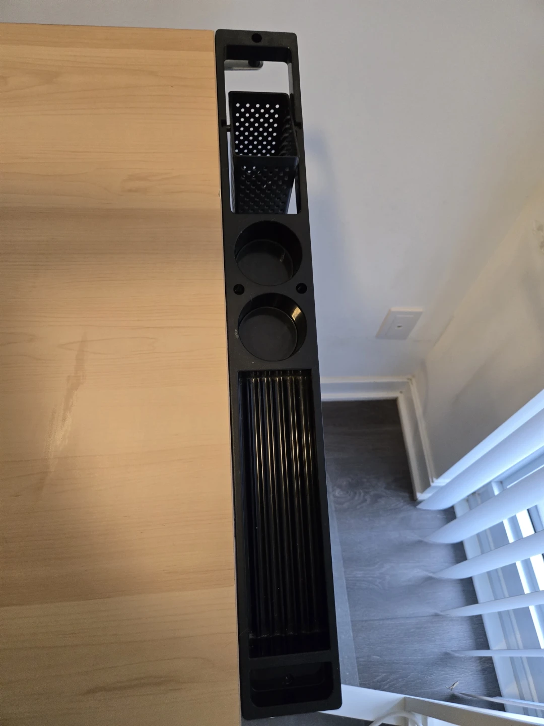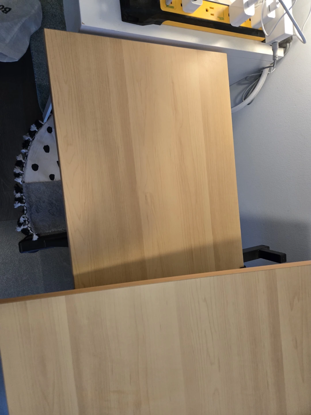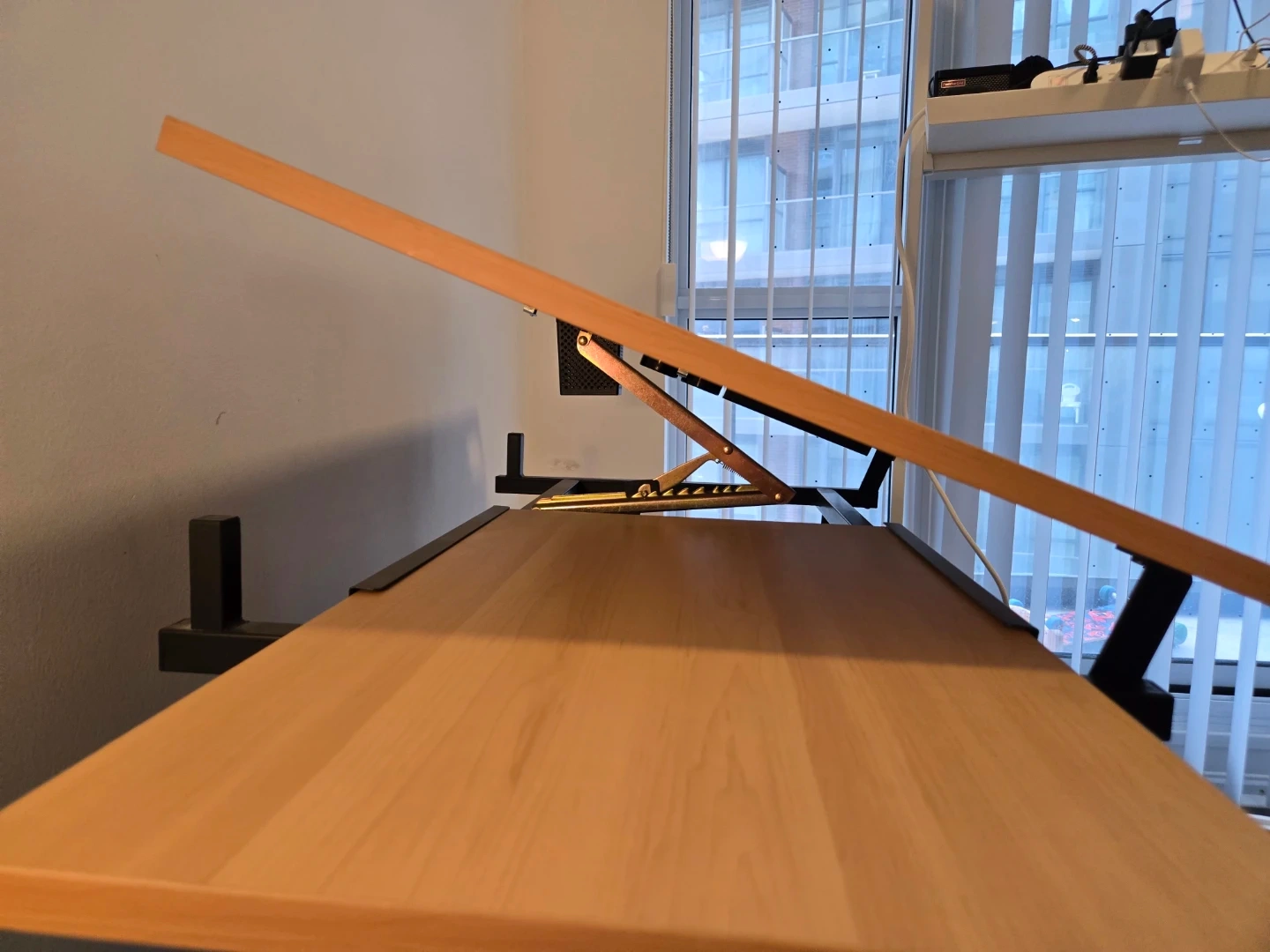 Here's an adjustable drafting table with some handy storage! It features a light wood-coloured tabletop and a black metal frame. There's a small black storage drawer underneath and a black tray on the side for holding supplies. Great for art projects or drafting!
