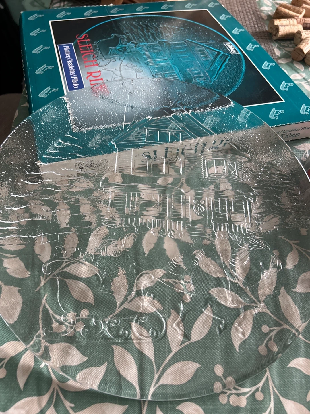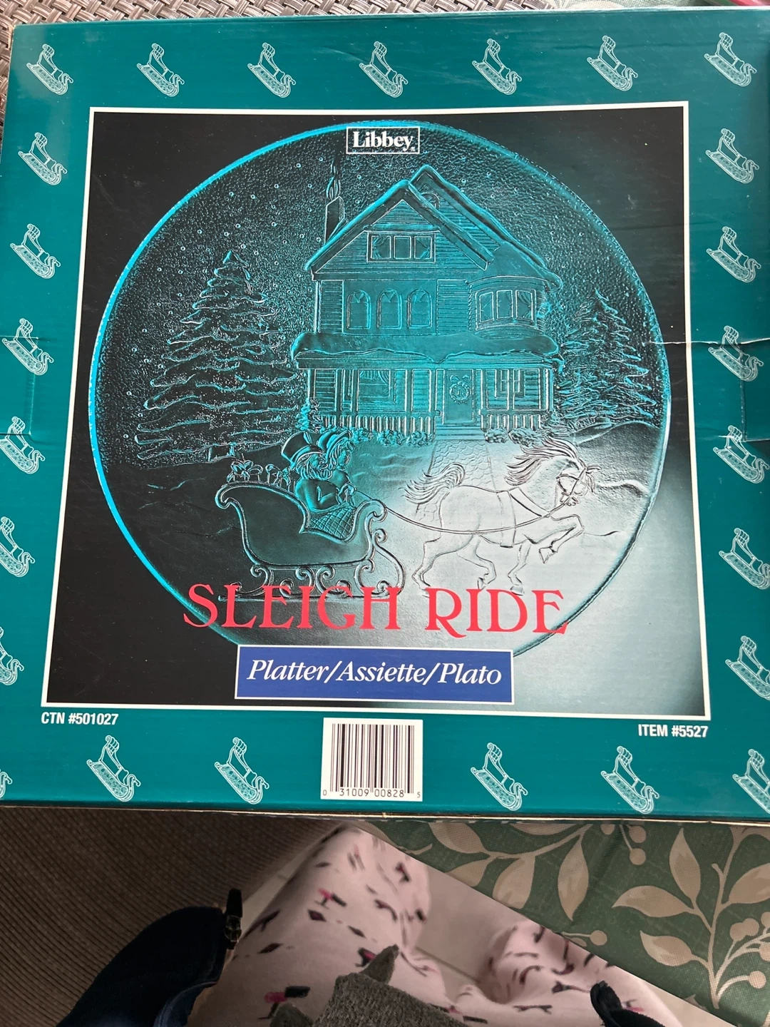 Selling a Libbey Sleigh Ride Platter/Assiette/Plato. The platter features a beautiful winter scene with a horse-drawn sleigh and a cozy house. It comes in its original box, making it perfect for gifting or adding to your holiday decor