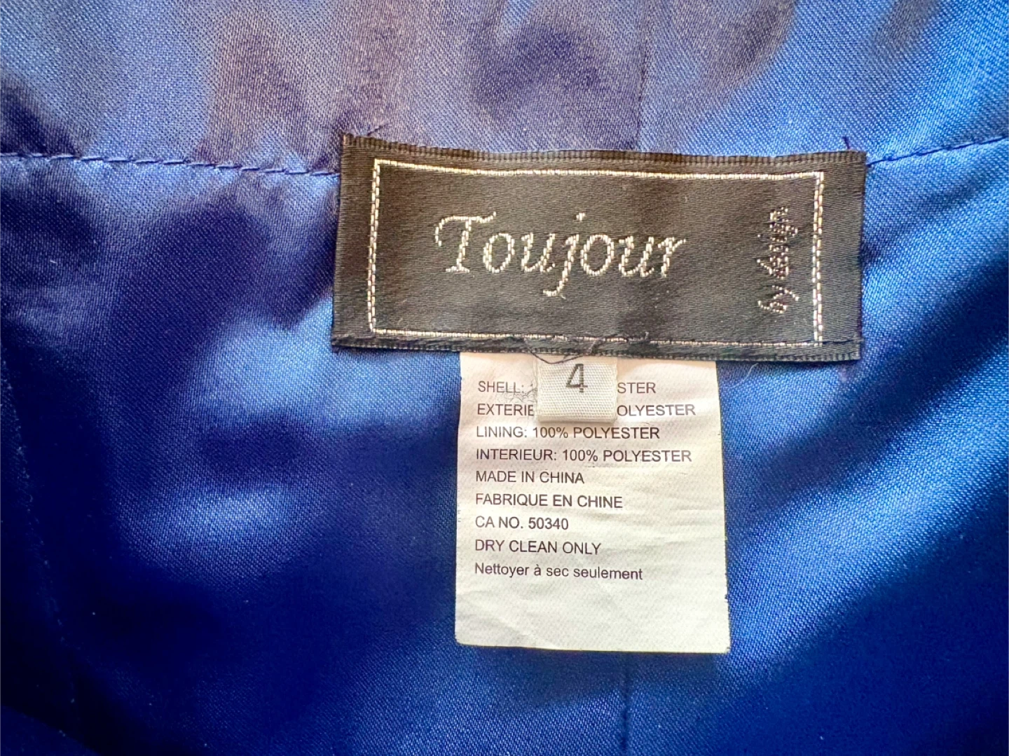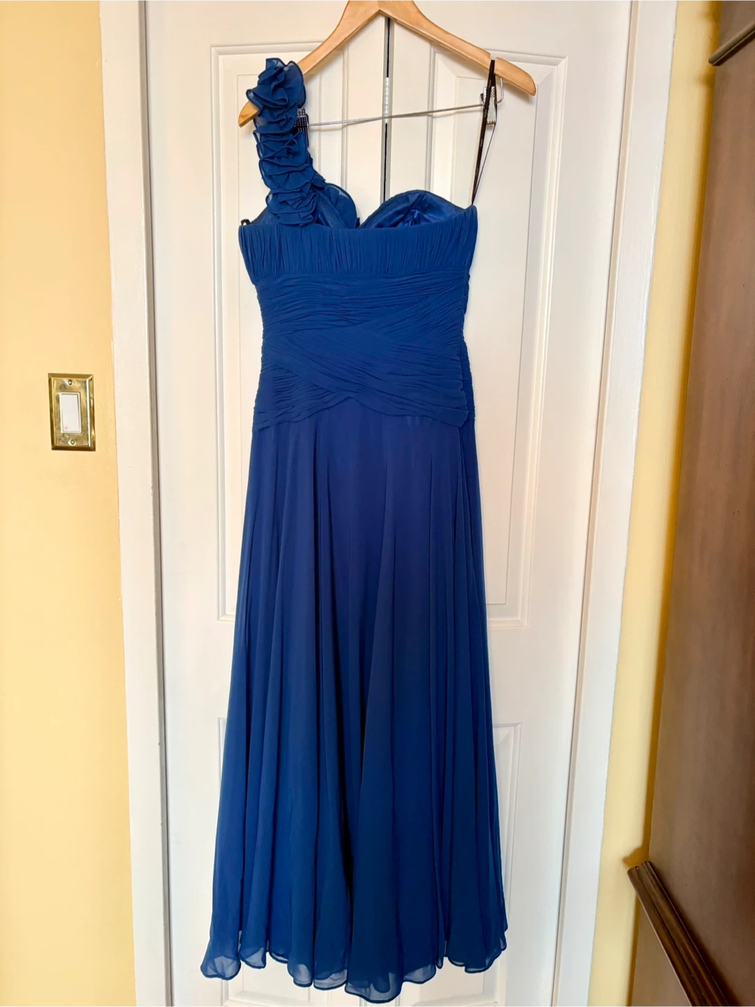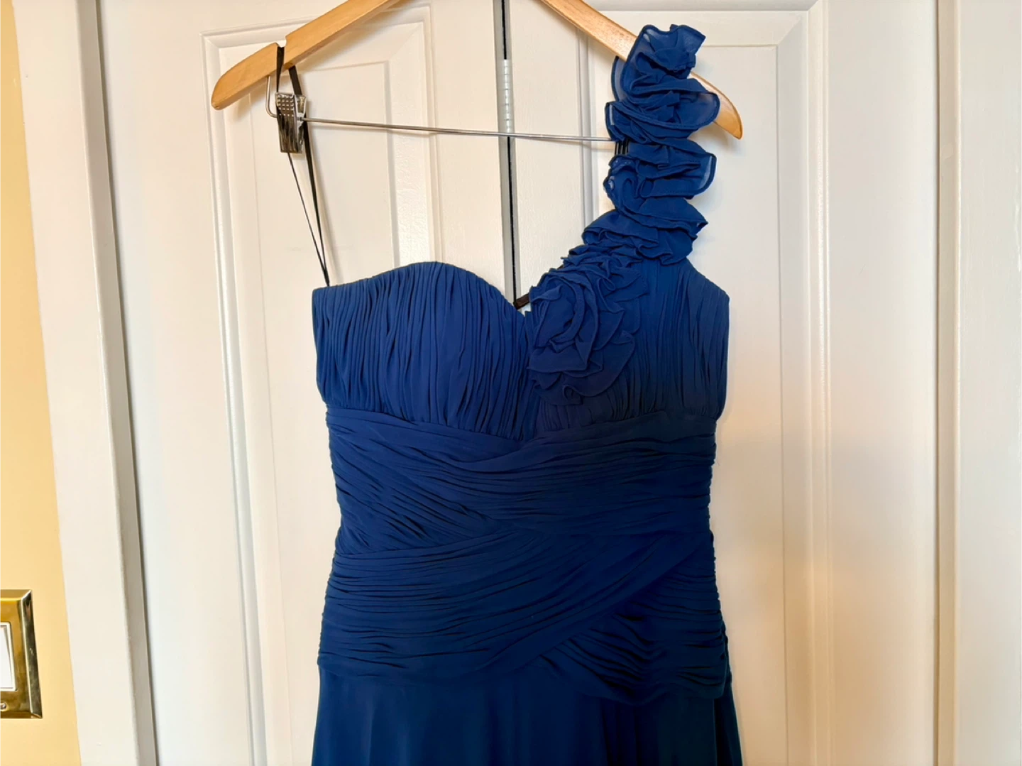 Selling a beautiful Toujour formal dress in a size 4. It's a lovely indigo blue shade, worn twice, excellent condition. One shoulder, feminine rosettes and flattering rouching for a sleek, fitted silhouette.