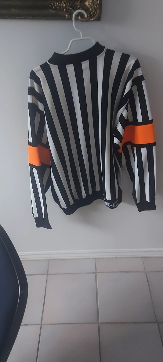 Here's a referee-style long sleeve shirt with black and white stripes and orange arm bands. It's in great condition and perfect for costume parties or sports events!