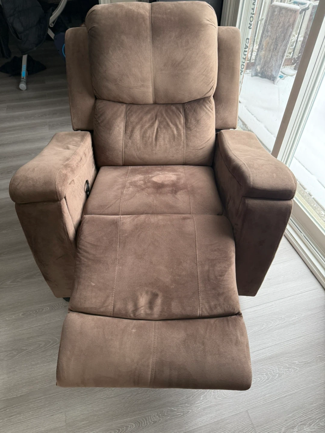 Selling a light brown recliner chair! It's in great condition and super comfy. The dimensions are approximately 65 inches (165cm) in length and 31.5 inches (80cm) in height when reclined. Perfect for relaxing after a long day!