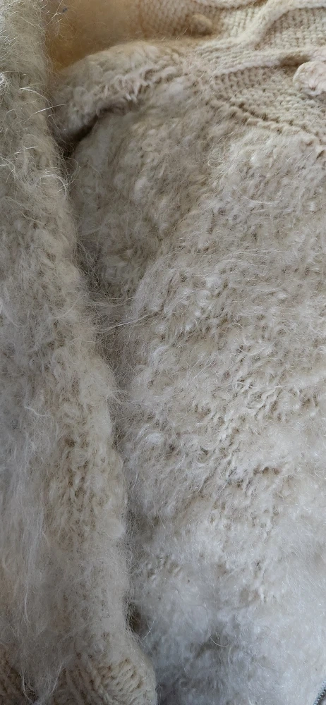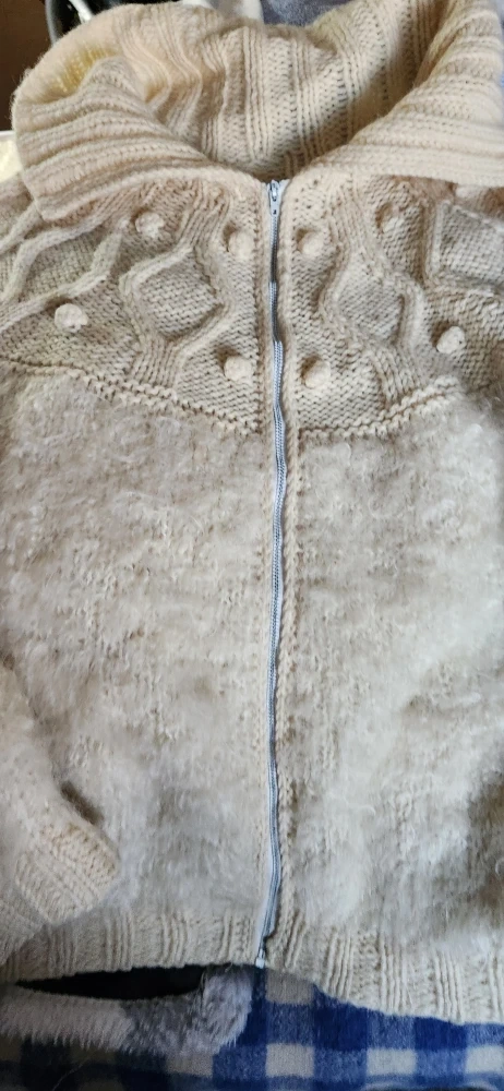 Selling a cozy cream-colored knit cardigan with a zipper. It's in great condition and perfect for layering on chilly days! The soft texture and unique knit pattern make it a stylish and comfortable addition to any wardrobe wool