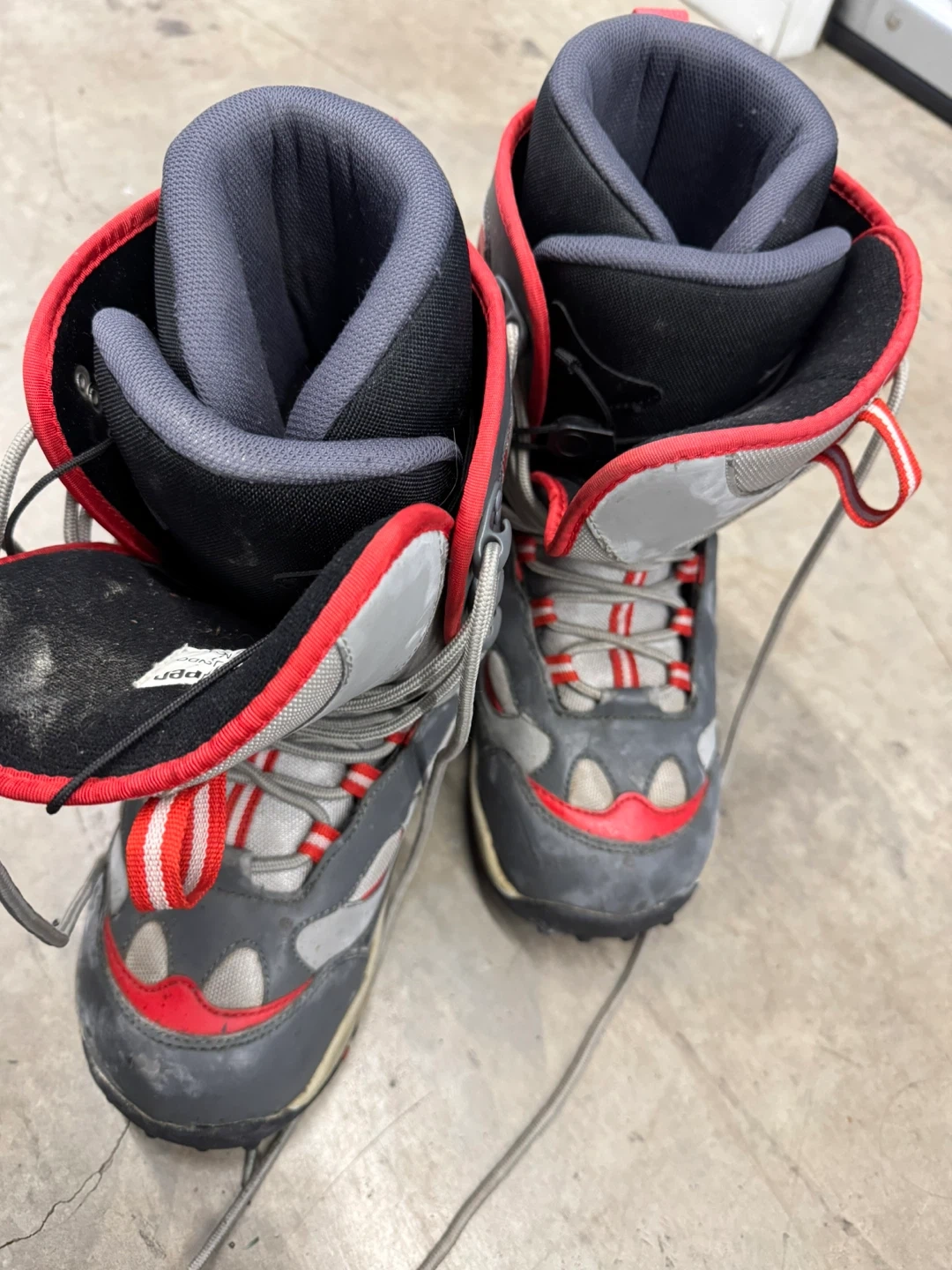 Selling a pair of Kemper snowboard boots in size 9 USA. They are grey, red, and black. The size is also 27.5 MONDO and 41 EU. Ready for the slopes!