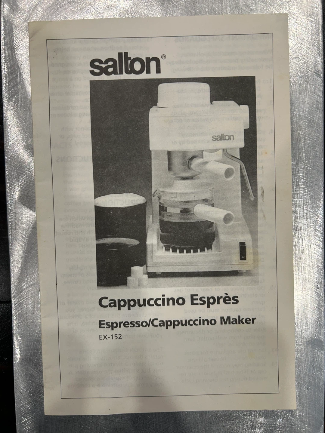 Selling a Salton Espresso/Cappuccino Maker, model EX-152. It comes with the original instructions. It's in good condition and ready to make some delicious espresso!