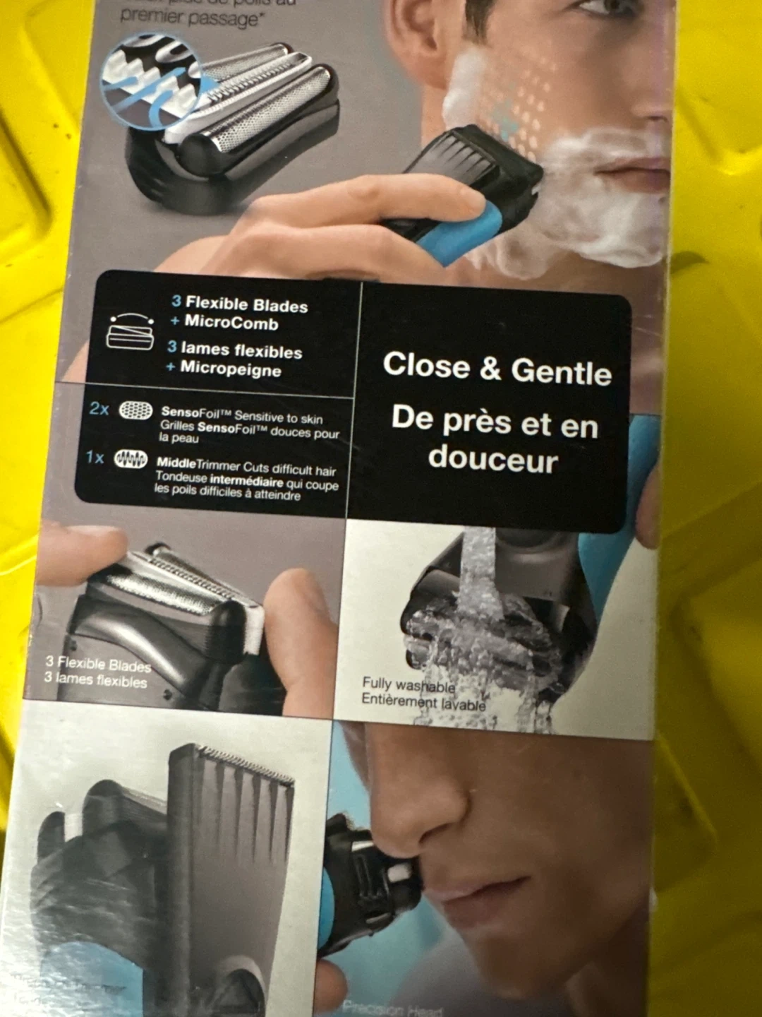 I'm selling a Braun Series 3 ProSkin 3040s electric shaver. It features 3 flexible blades and a MicroComb for a close and gentle shave. It's also fully washable and can be used in the shower. It has a precision trimmer and provides 45 minutes of shaving time