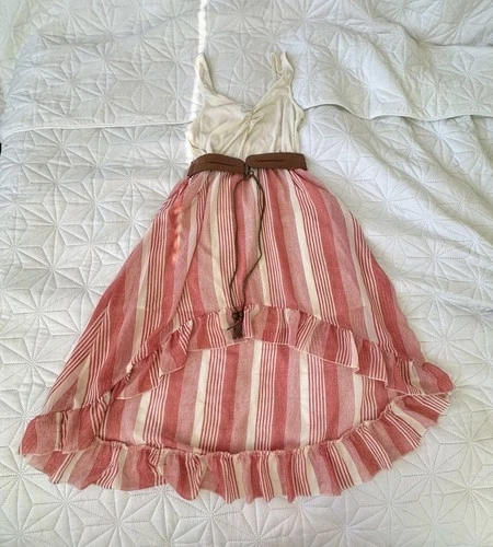 The Striped Ruffle-Hem Sundress in Pink & Cream is a stylish and versatile addition to any woman's wardrobe. The hi-low skirt with a belt adds a touch of sophistication to the dressy top, perfect for a casual day out or a special occasion. The ruffle accents and low rise give it a trendy and feminine flair.