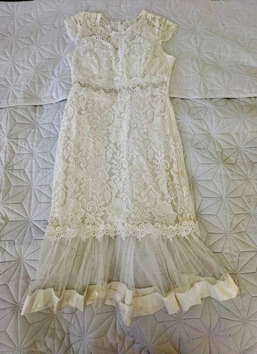 Cream Lace Midi Dress with Sheer Tulle Hem
