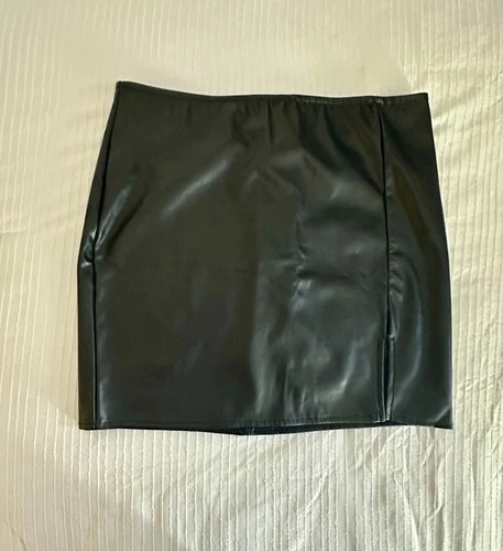 Classic black faux leather mini skirt with a simple, clean silhouette. High-waisted fit with a short mini length and a small slit at the front hem for easier movement. Hidden zipper closure at the back.