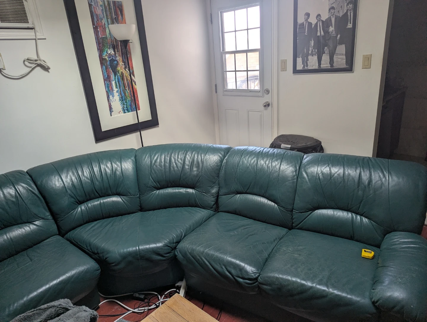 Selling a comfy green leather sectional sofa. It's in good condition and would be perfect for a living room or basement. It's a great piece to relax on after a long day! It's a 3 piece sectional. Dimensions are: